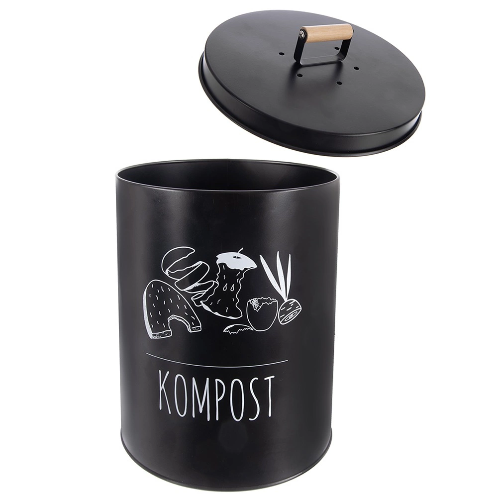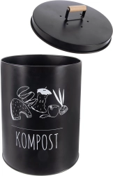 De robuuste metalen uitvoering in het zwart garandeert een lange levensduur en bestendigheid bij dagelijks gebruik. Het goed afsluitende deksel minimaliseert geurverspreiding en houdt insecten buiten, terwijl de houten handgreep de handling vergemakkelijkt. Het onderhoud is eenvoudig – afnemen met een vochtige doek is voldoende.