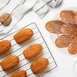 Laat de madeleines na het bakken afkoelen op een rooster voor een perfecte textuur en brosheid zonder condens.