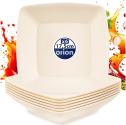Praktische set van 6 diepe borden in een modern vierkant design voor dagelijks gebruik, thuis en buiten. De borden met afmetingen 17,5 × 17,5 × 4,7 cm en een inhoud van 500 ml zijn licht, duurzaam en makkelijk te onderhouden. Geschikt voor in de magnetron en de vaatwasser, ideaal voor soepen, pasta, salades en eenpansgerechten. Het hoogwaardige materiaal in crèmekleur biedt slag- en barstbestendigheid.