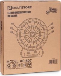 In de doos vind je 12 soft-tip pijlen met reservepunten, montagematerialen en een handleiding met spelregels. Sluit aan op het lichtnet, kies een modus en begin met spelen.