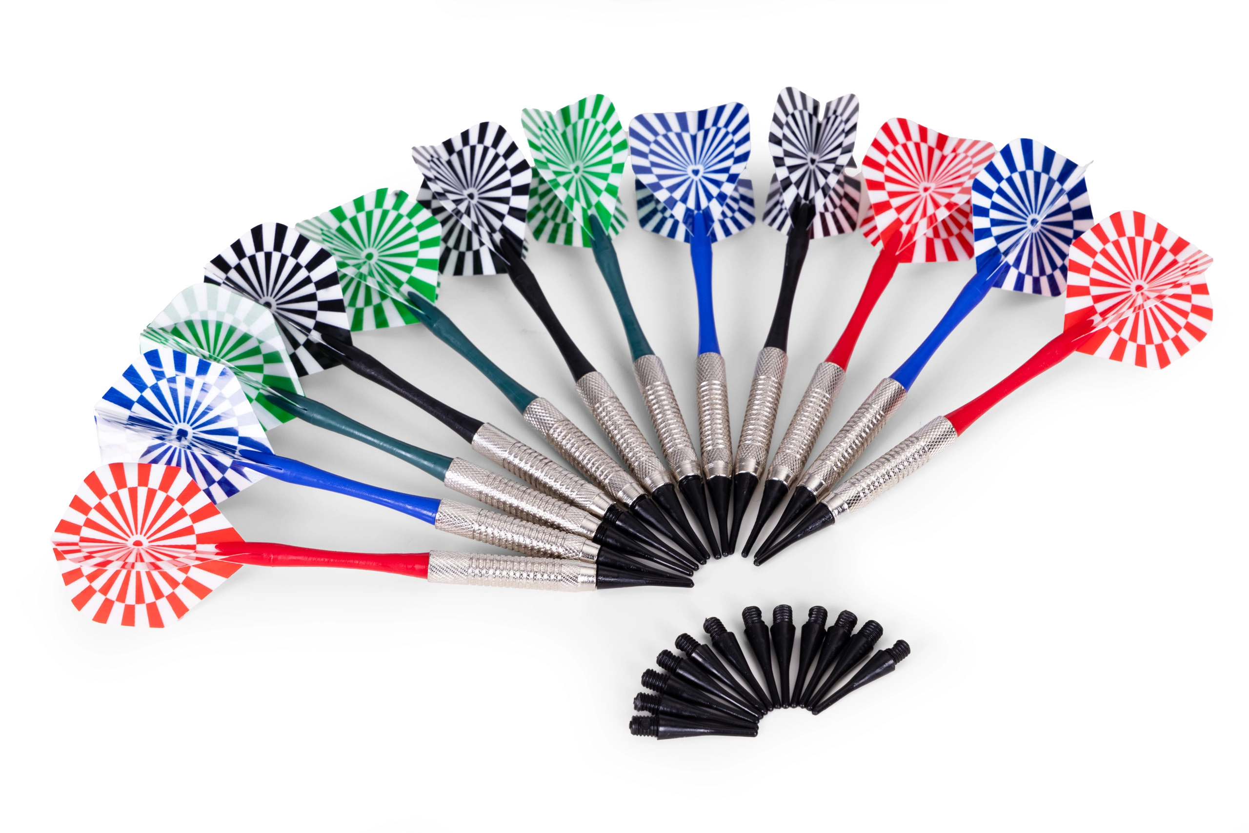 In de verpakking zitten 12 zachte pijlen met decoratieve flights en 12 reservepunten. De hoogwaardige afwerking en gebalanceerde pijlen ondersteunen een precieze en consistente worptechniek. Ook inbegrepen zijn een montageset en een handleiding met spelregels – sluit aan, kies een modus en speel.