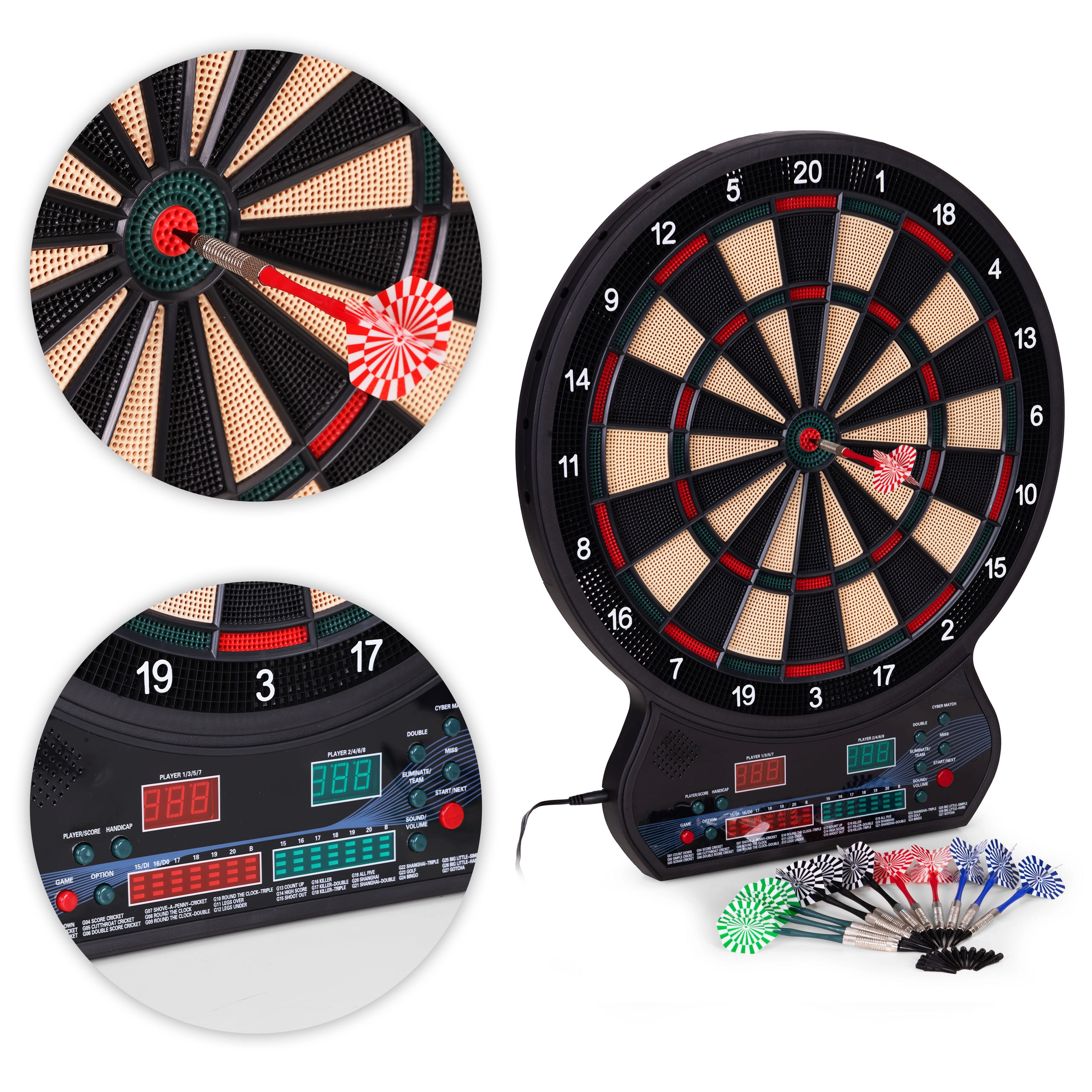 De twee displays tonen overzichtelijk de score en de actieve speler. Ingebouwde geluiden en spraakprompts houden het tempo erin en voorkomen oponthoud tussen worpen.