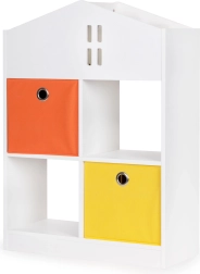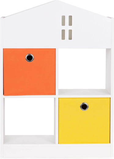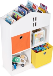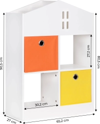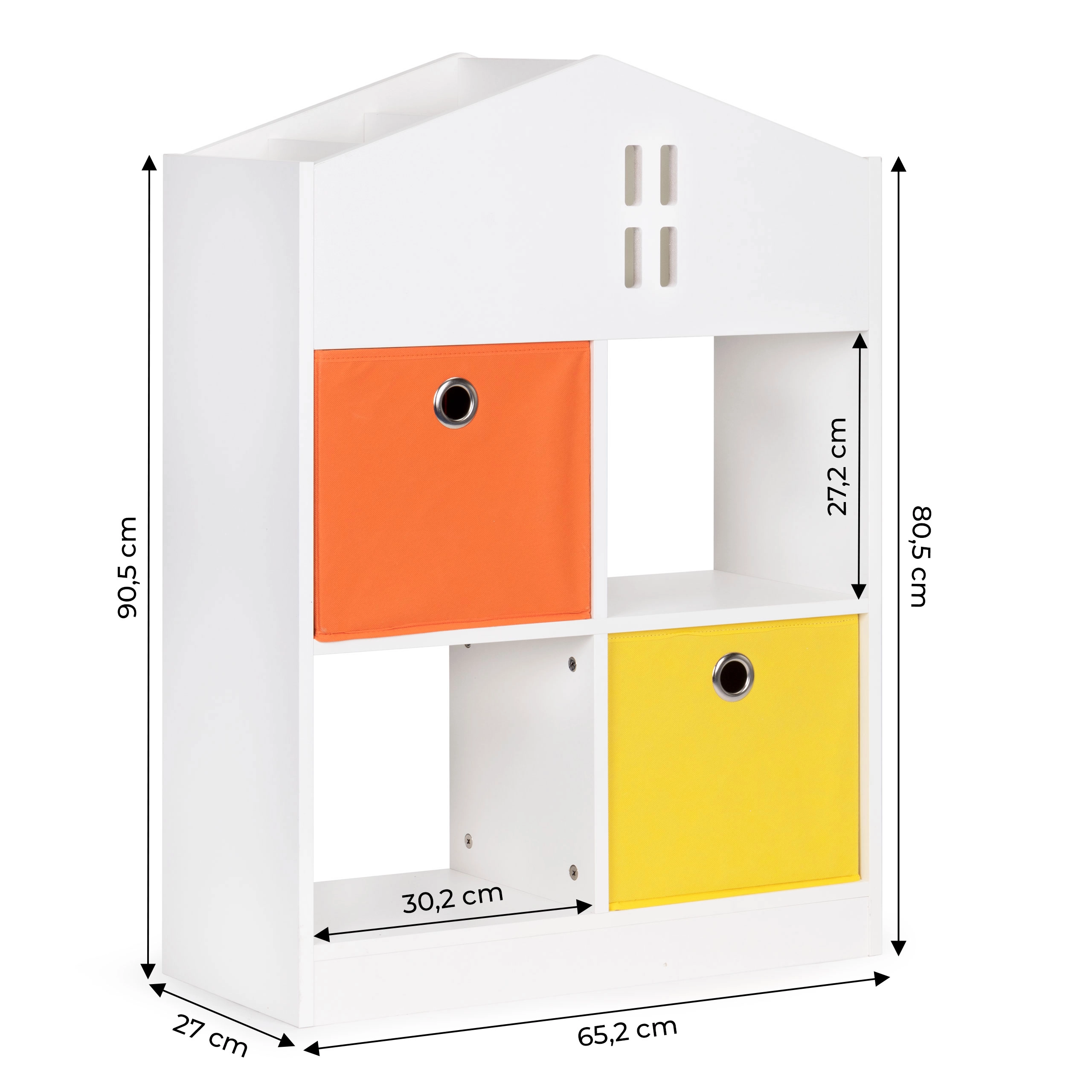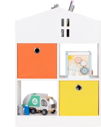 Deze kinderboekenkast in de vorm van een huisje is ideaal voor het opbergen van boeken, speelgoed en kleine spulletjes die je kind graag binnen handbereik heeft. Dankzij de vier ruime planken, praktische vakken en 2 stoffen manden creëer je eenvoudig een overzichtelijk organisatiesysteem. De strak witte kleur past in elk interieur – in de kinderkamer, speelkamer of wachtkamer.