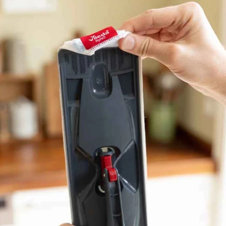 De hoes wordt eenvoudig op de mopbasis bevestigd en blijft stevig zitten tijdens het schoonmaken. Alleen compatibel met de Vileda H2Pro-mop.