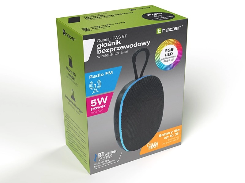 De compacte en lichte TRACER Quasar TWS BT‑luidspreker neem je overal mee naartoe. Hij biedt Bluetooth 5.3 voor een stabiele verbinding, TWS‑koppeling van twee units voor stereo, een vermogen van 5 W, tot 3 uur afspelen op een 500 mAh‑accu, een ingebouwde FM‑radio en weergave vanaf microSD/USB – alles in een robuuste behuizing met een praktisch polslusje.