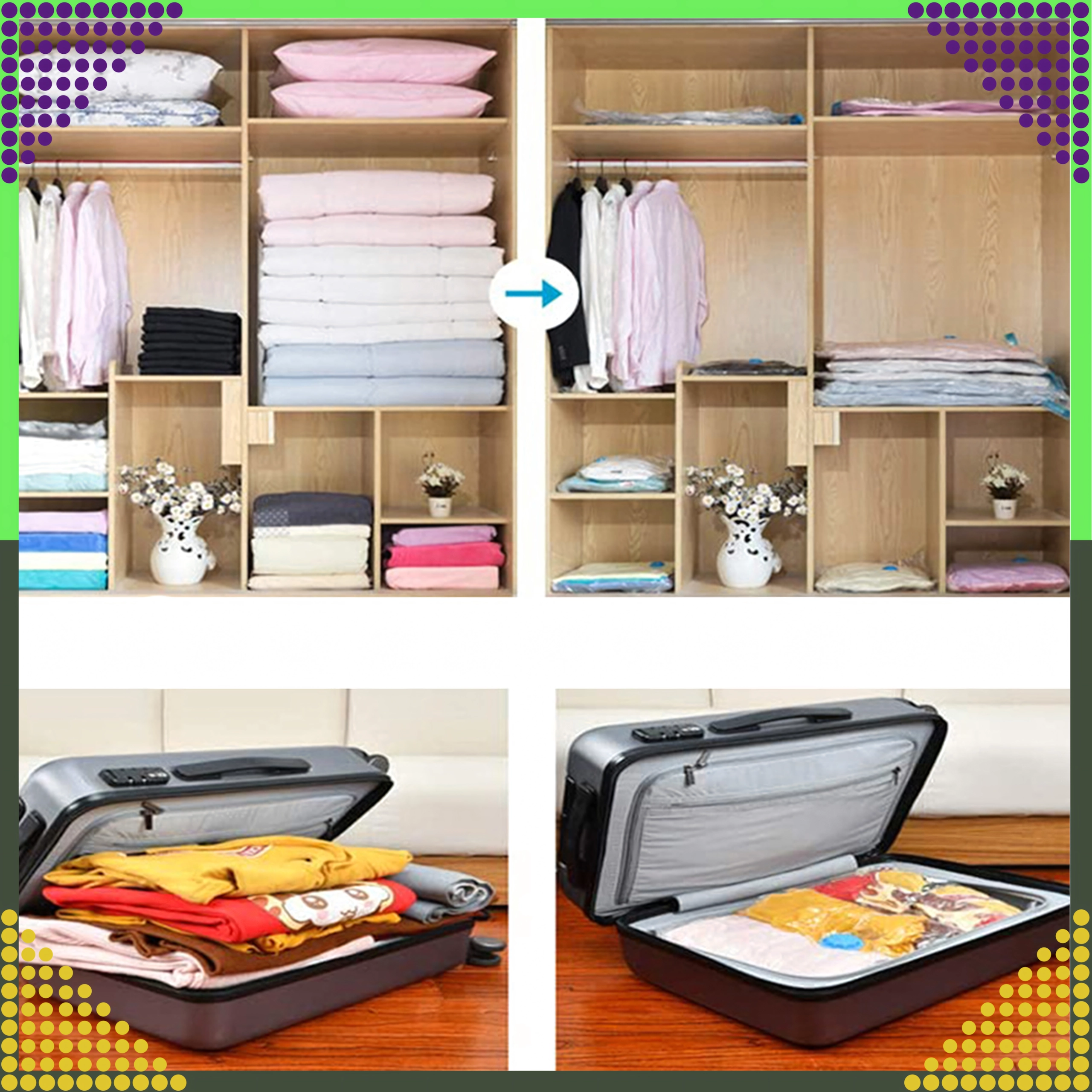 Zuig de lucht uit via het ventiel en verklein het volume van jassen, truien en dekbedden. Kasten blijven overzichtelijk en ruim.