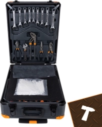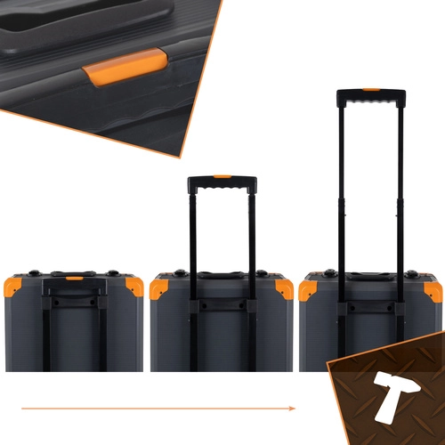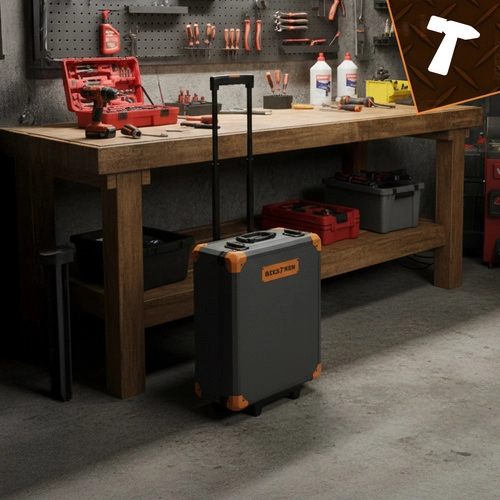 De robuuste aluminium koffer met verstelbare handgreep, wieltjes en verstevigde hoeken zorgt voor comfortabel en veilig vervoeren van de complete set, thuis, in de garage of onderweg.