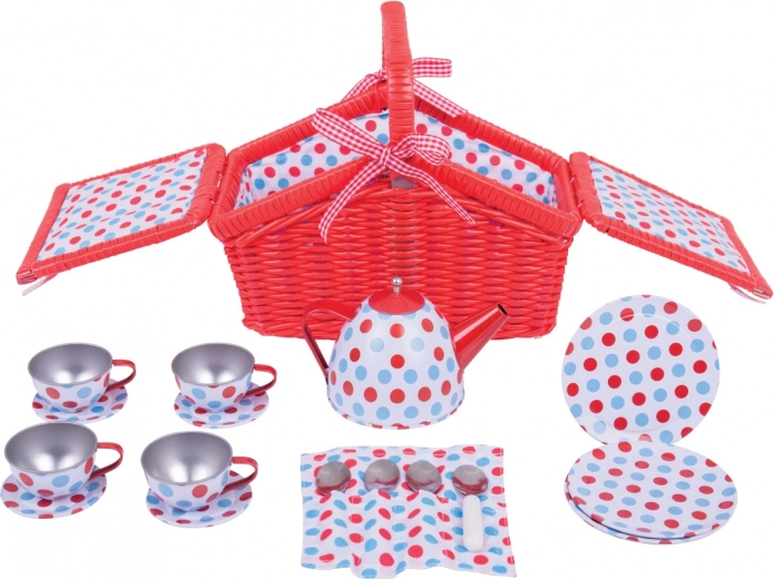 Betoverend theeservies in een rode rieten mand brengt speelplezier. Bevat vier kopjes, schoteltjes, een pot met lepels, ideaal voor kindertheefeestjes thuis en onderweg.