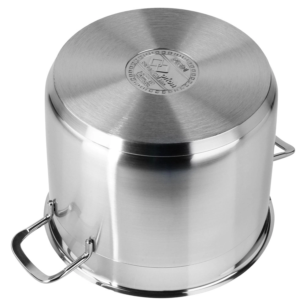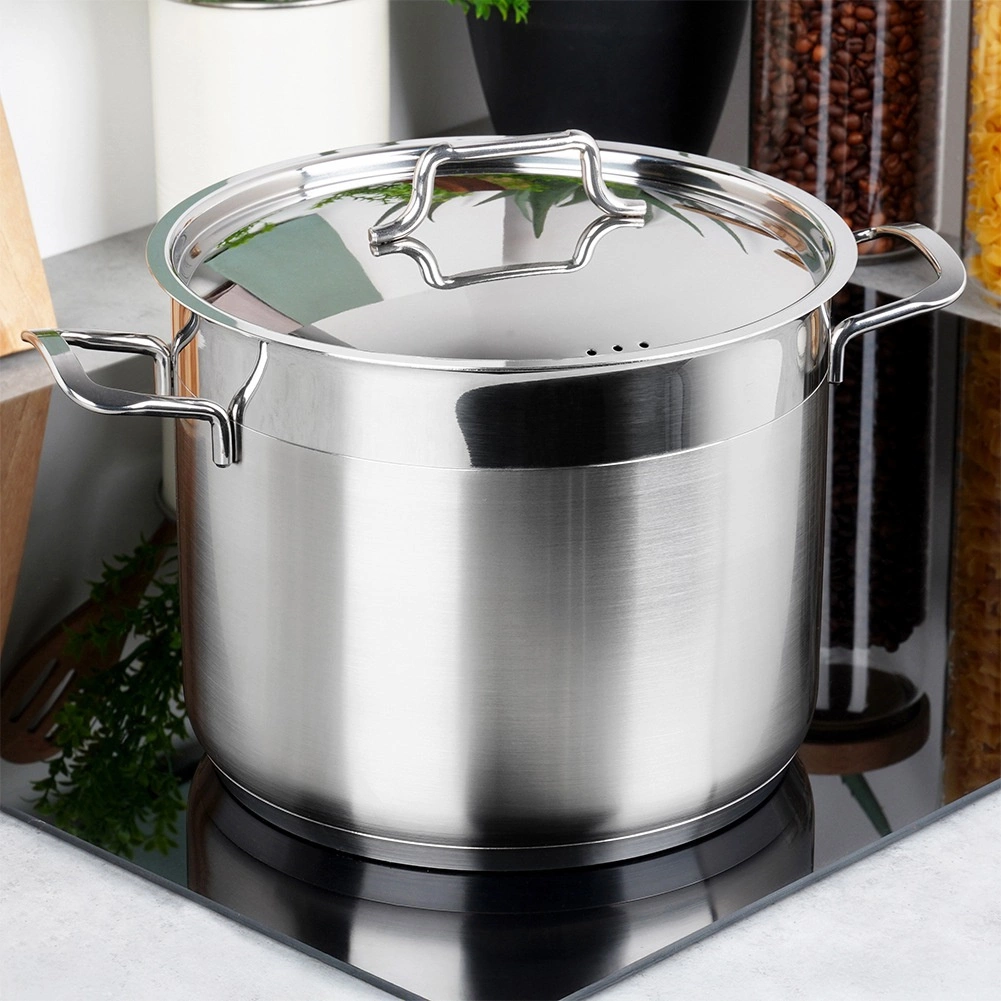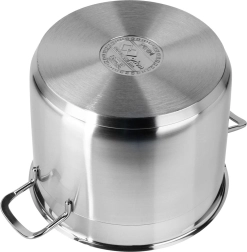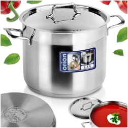Premium roestvrijstalen pan met deksel met een inhoud van 6,5 l, ideaal voor dagelijks koken en stoven. Dankzij de meerlaagse acute-thermische bodem accumuleert en verdeelt hij warmte gelijkmatig, is hij geschikt voor alle soorten kookplaten, inclusief inductie en maakt hij energiezuinig koken met minimaal vet mogelijk. Hoogwaardig RVS 18/10, massieve wanden, comfortabele grepen en eenvoudig schoon te maken, ook in de vaatwasser, maken van deze pan een betrouwbare hulp in elke keuken.