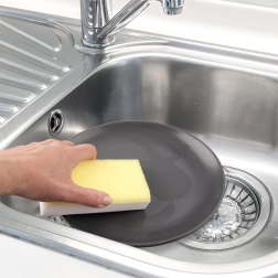 Alleen met water bevochtigen en de spons klaart de klus met aangekoekte resten en vet op borden, pannen en potten. Bespaart tijd, geld en het milieu.