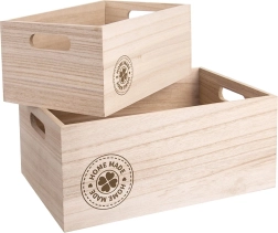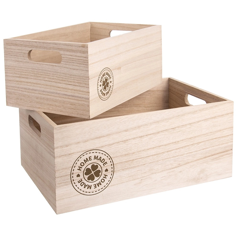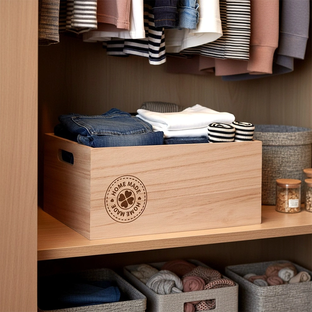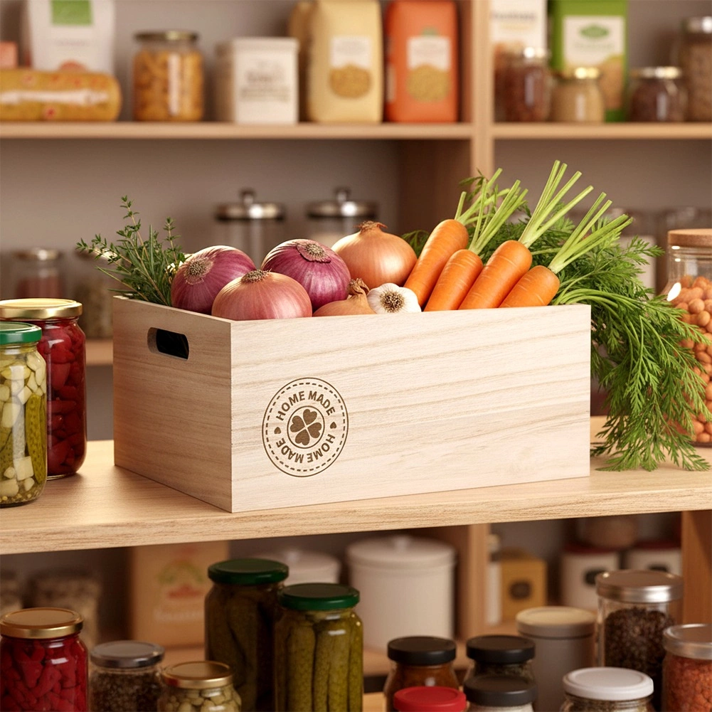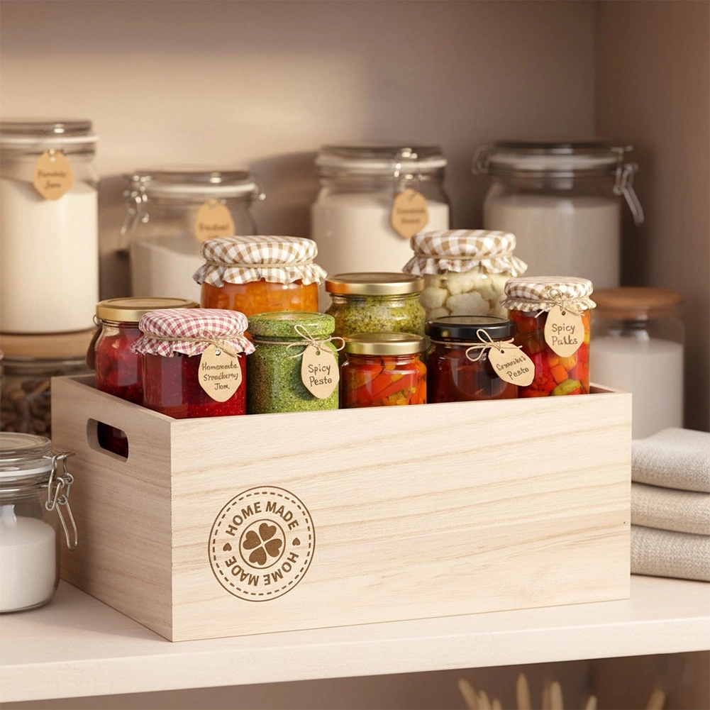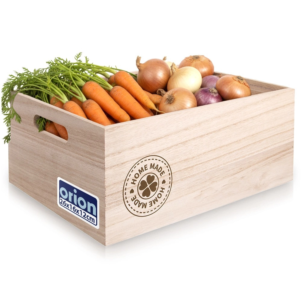 Ontdek een elegant en functioneel oplossing voor dagelijkse organisatie. De houten opbergbak met afmetingen 26 × 16,5 × 11,5 cm valt op door de natuurlijke look, de stevige constructie en de comfortabele handgrepen voor veilig dragen. De decoratieve “Home Made”-opdruk geeft je interieur een knusse touch.