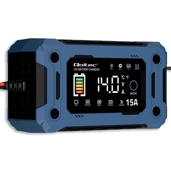 Verleng de levensduur van je accu met een intelligente, microprocessorgestuurde oplader. Herkent automatisch het accutype, past de laadcurve aan en schakelt na volledig laden over op de onderhoudsmodus, waardoor overladen wordt voorkomen. Het grote LCD-scherm toont spanning, stroom, laadstatus en de gekozen modus, terwijl de aanraaktoets MODE de bediening vereenvoudigt.