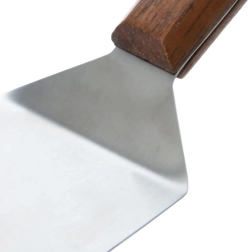 Universele keukenspatel van hoogwaardige roestvrijstalen staal met een comfortabele houten handgreep. Ideaal voor pan en grill voor omdraaien, opscheppen en serveren van gerechten. Duurzaam, licht flexibel blad met een afgeschuinde rand maakt het eenvoudig om onder het eten te schuiven en de ergonomische handgreep zorgt voor een zekere grip.