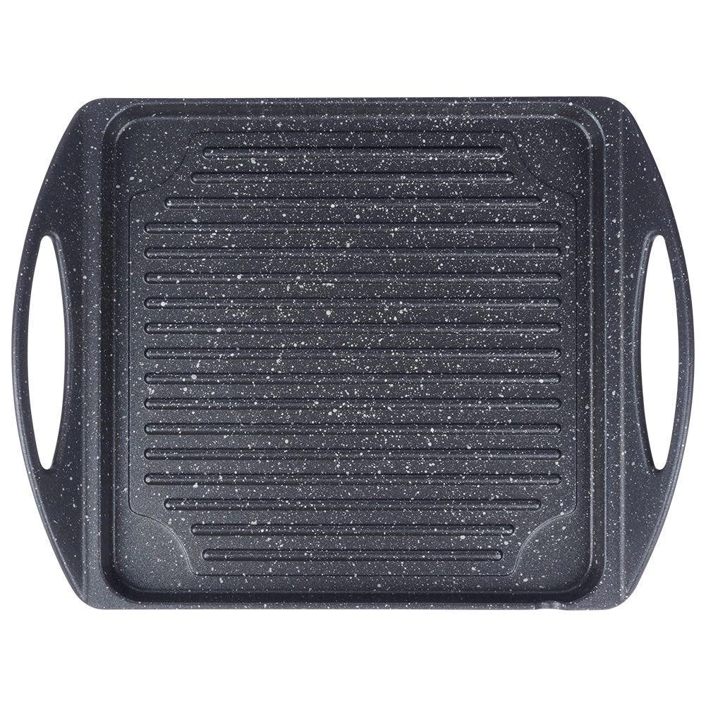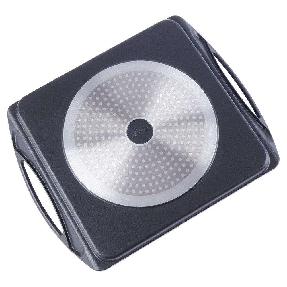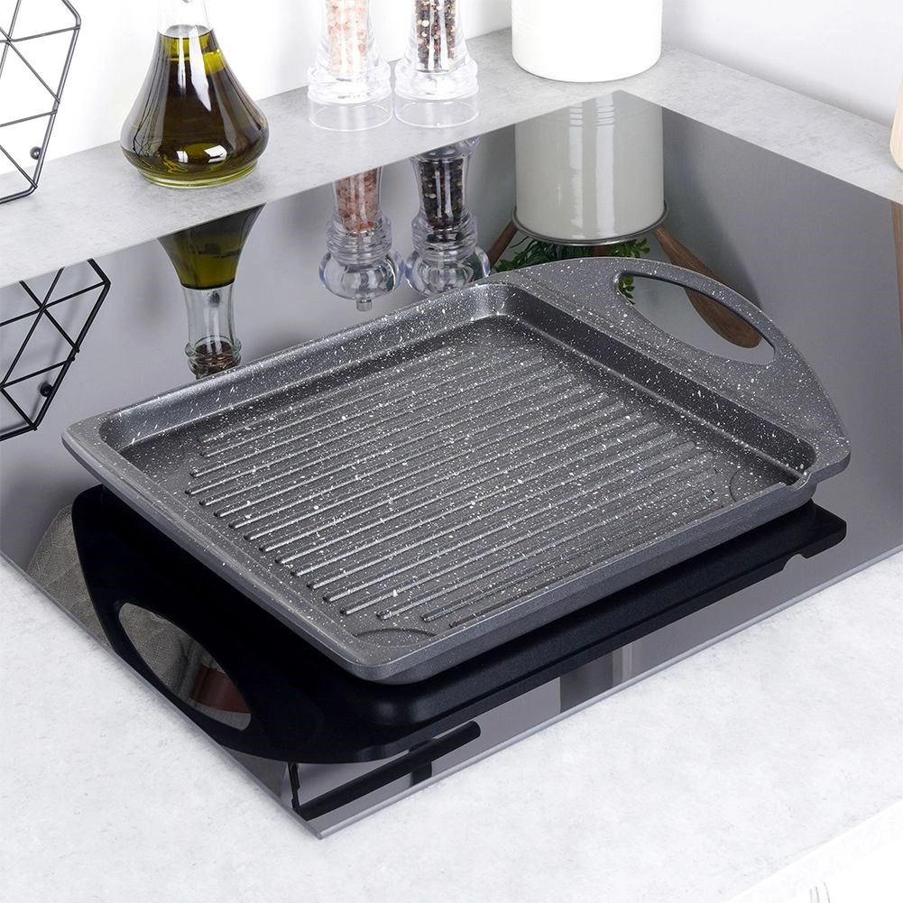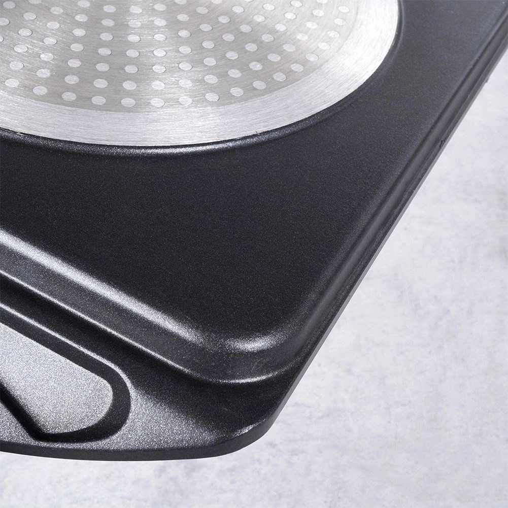 Dankzij de aluminium kern warmt de plaat snel en gelijkmatig op, wat energie bespaart. Geïntegreerde zijgrepen zorgen voor veilige hantering. Na gebruik is schoonmaken eenvoudig – de plaat is vaatwasserbestendig. Te gebruiken op gas-, elektrische, keramische en inductiekookplaten, in de oven en op de barbecue (niet direct in de vlammen plaatsen).