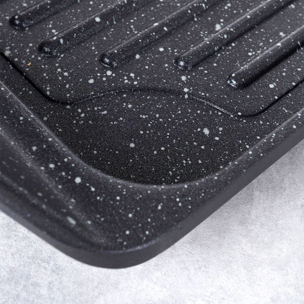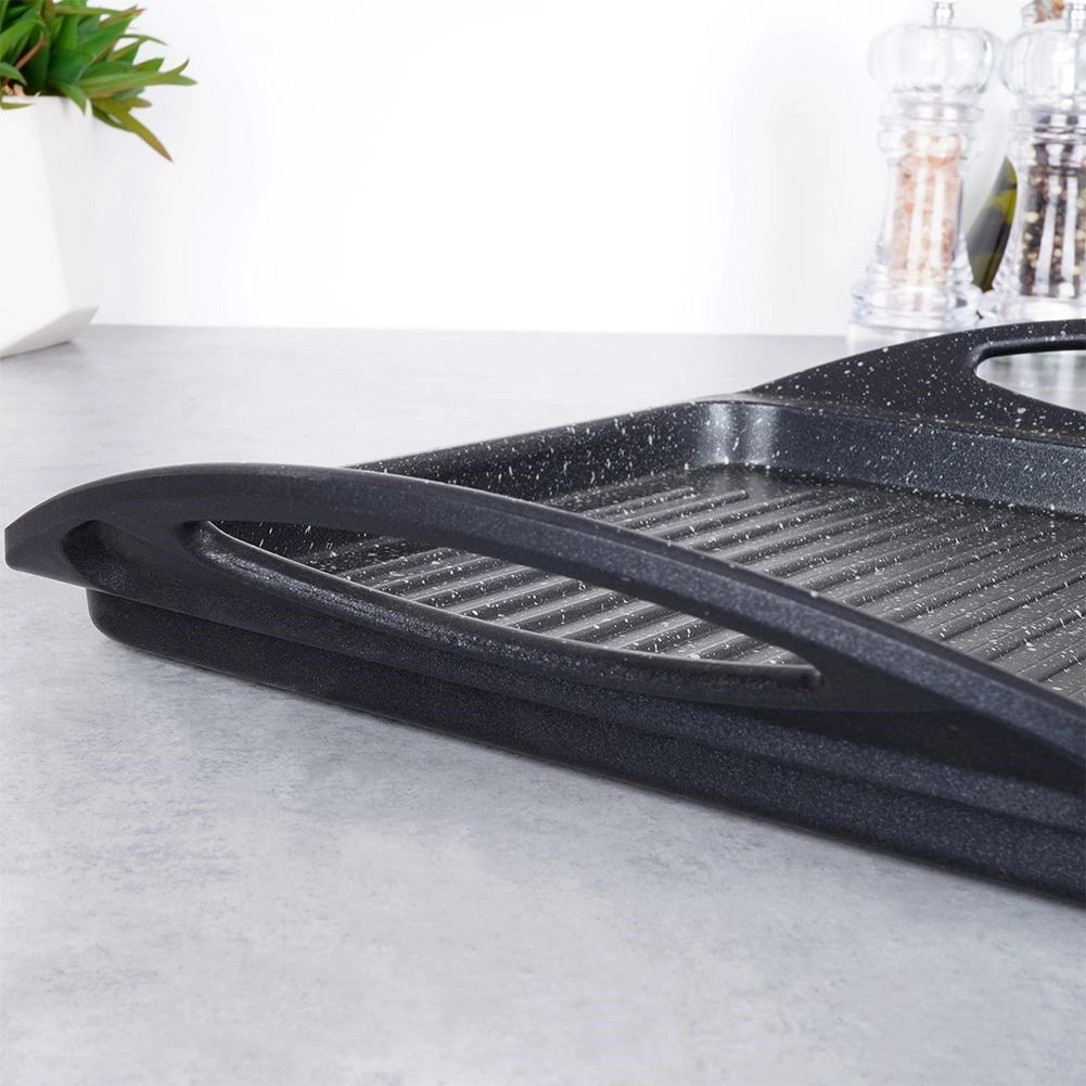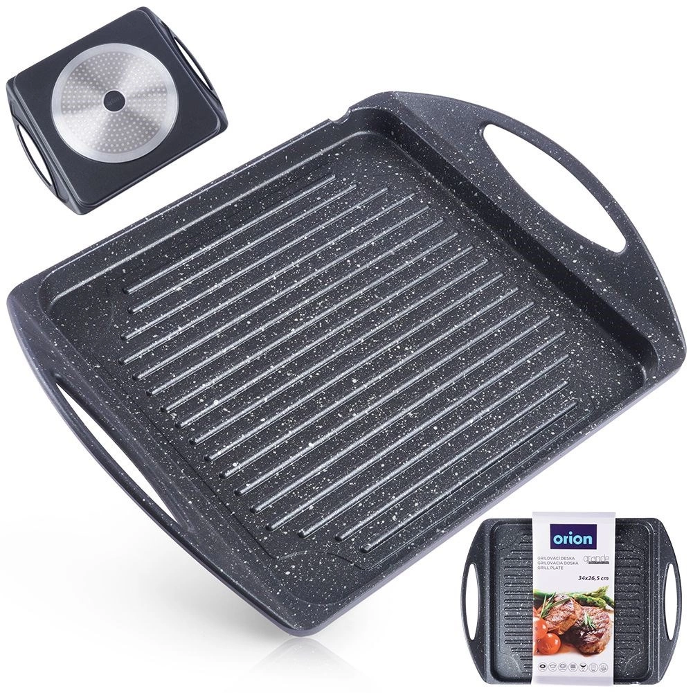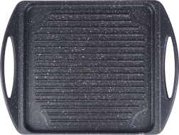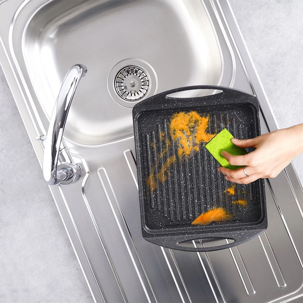 Dankzij de aluminium kern warmt de plaat snel en gelijkmatig op, wat energie bespaart. Geïntegreerde zijgrepen zorgen voor veilige hantering. Na gebruik is schoonmaken eenvoudig – de plaat is vaatwasserbestendig. Te gebruiken op gas-, elektrische, keramische en inductiekookplaten, in de oven en op de barbecue (niet direct in de vlammen plaatsen).