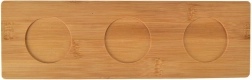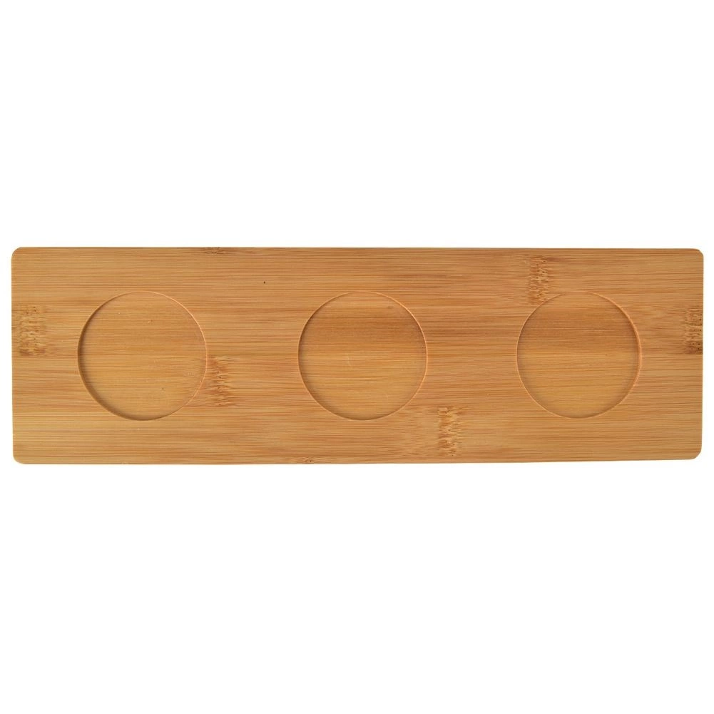 De rechthoekige plank van natuurlijk bamboe houdt de schaaltjes op hun plek, ook tijdens het dragen. Bamboe is licht, sterk en van nature bestand tegen vocht en geuren.