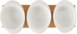 Deze WHITELINE designset combineert praktische bruikbaarheid met esthetiek voor dagelijks en feestelijk tafelen. Drie witte porseleinen schaaltjes met ergonomische rand worden aangevuld met lepeltjes en een stabiele bamboeserveerplank met toegewezen plaatsen, zodat de schaaltjes niet verschuiven tijdens het dragen. Perfect voor olijven, nootjes, antipasti, sauzen en homemade dips.