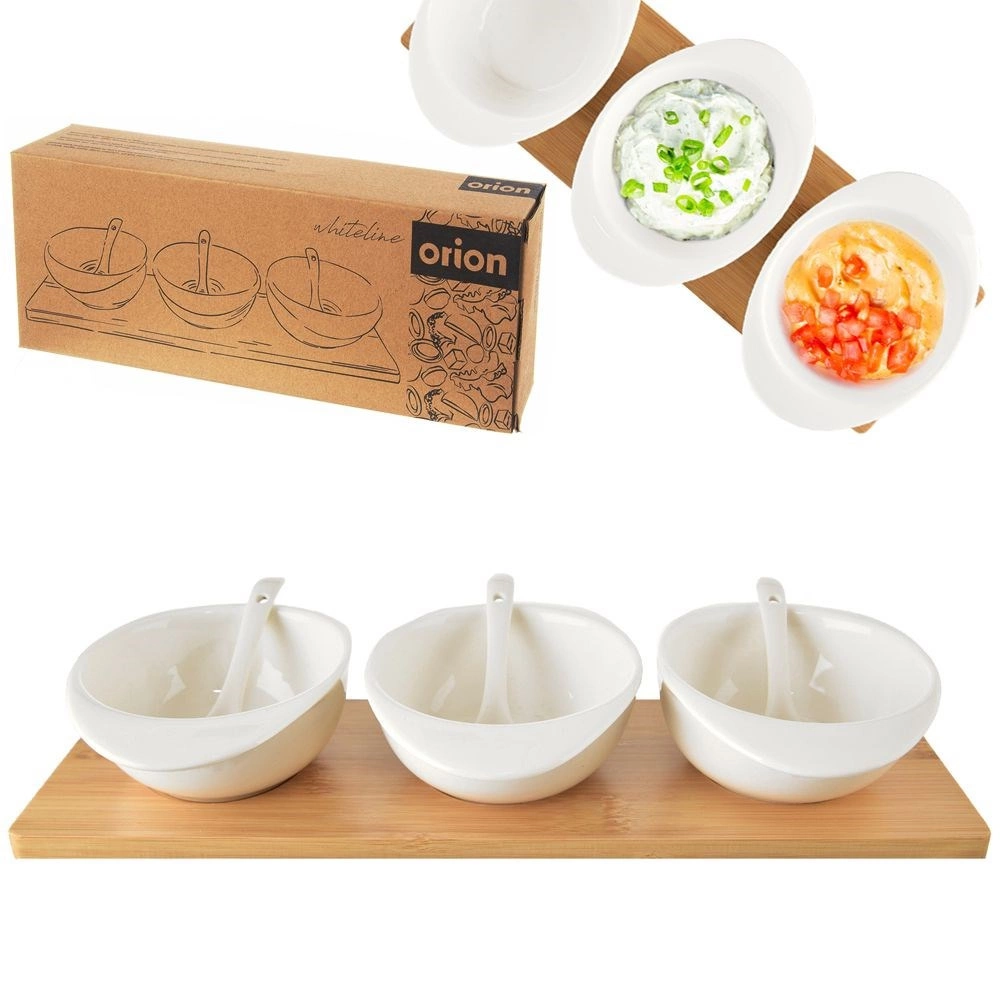 Drie witte schaaltjes met ergonomisch gevormde rand worden aangevuld met praktische lepeltjes – ideaal voor dips, sauzen en kleine versnaperingen.