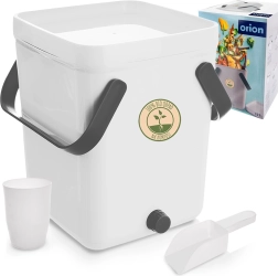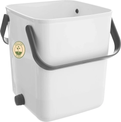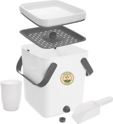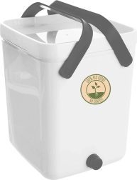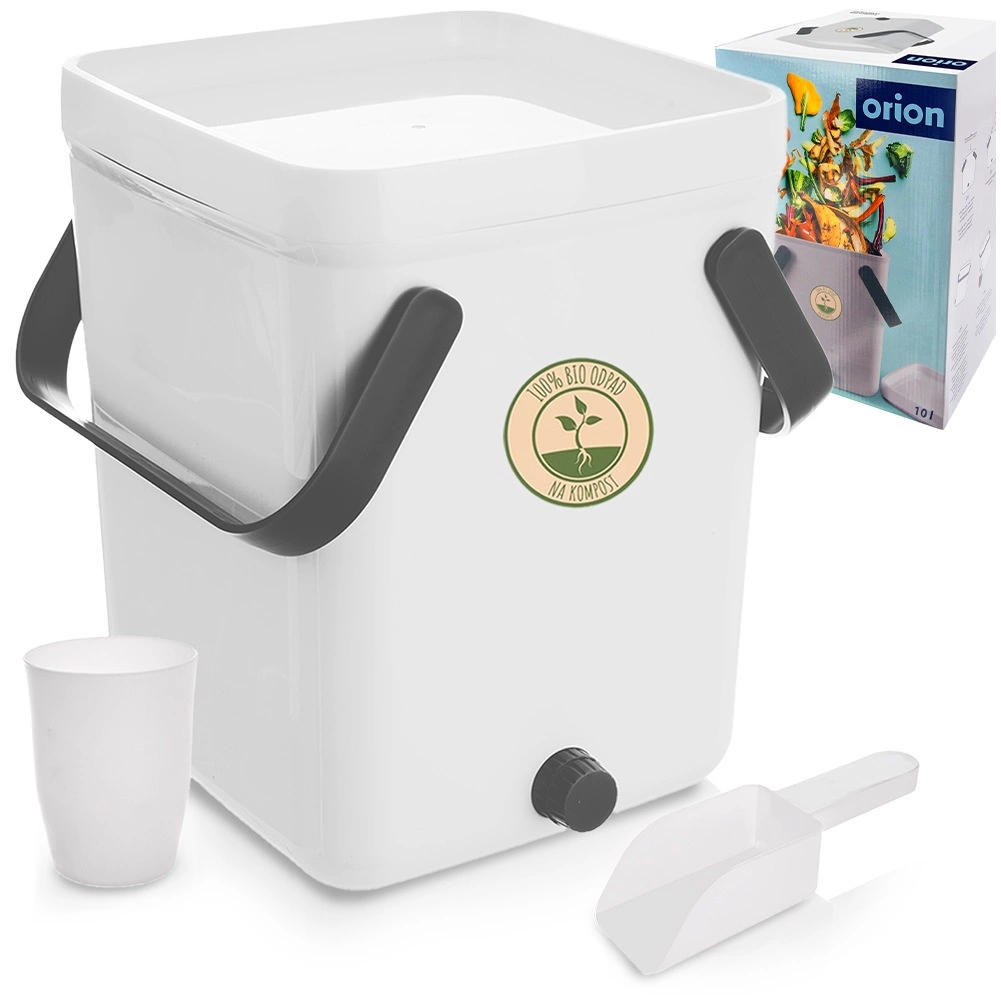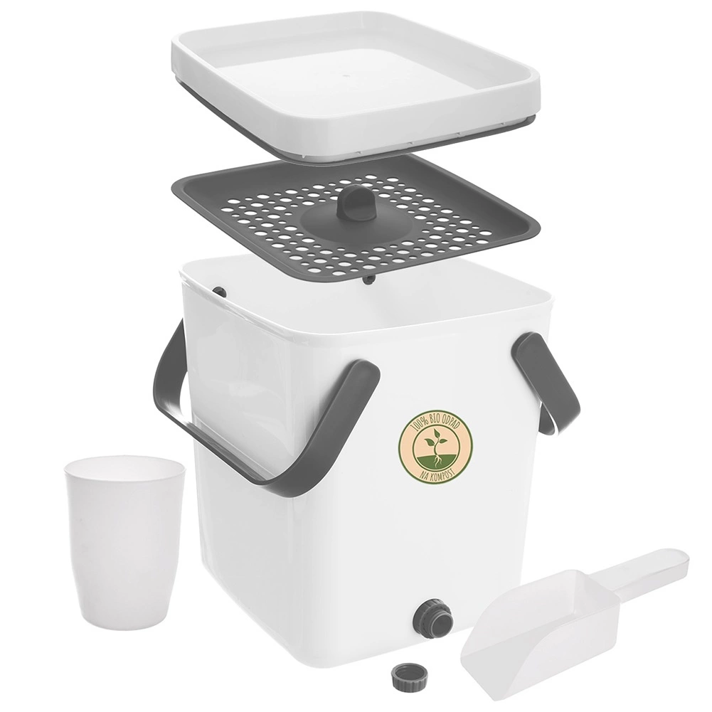 Het sluitende deksel met hoogwaardige afdichting zorgt voor schoon en veilig gebruik in de keuken. De composter is gemaakt van duurzaam plastic (wit lichaam, grijze handgrepen) en heeft inklapbare grepen voor gemakkelijk dragen. De set bevat een zeef voor het scheiden van vloeistof, een maatbeker en een schepje.