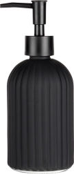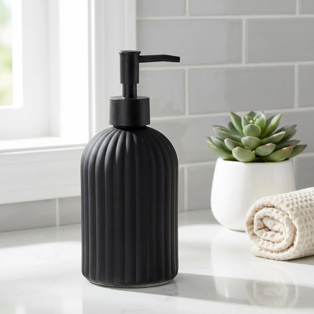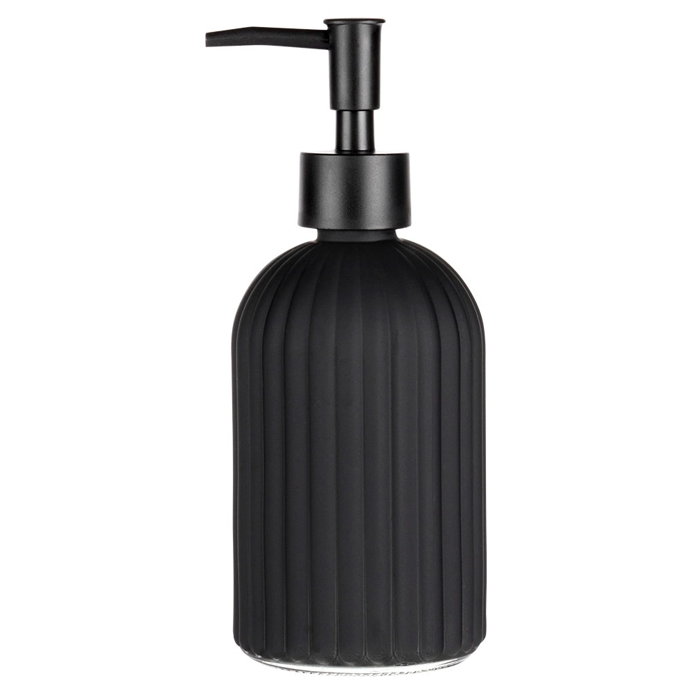 Stijlvolle zeepdispenser van hoogwaardig glas in matzwart, een praktische én decoratieve toevoeging voor je badkamer of keuken. Het getextureerde, geribbelde oppervlak biedt een zekere grip en duurzaamheid, terwijl de strakke lijnen de moderne look van het interieur benadrukken.