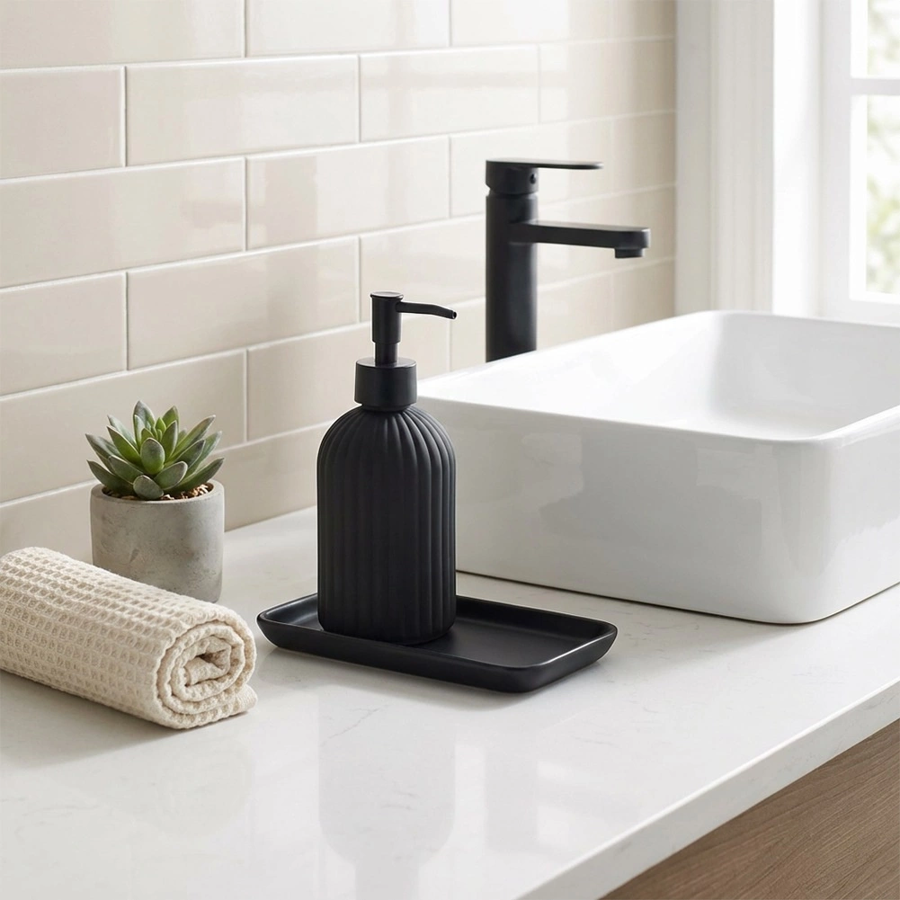 De dispenser houdt de inhoud op één plek, voorkomt ontsierende plastic flessen en verbetert de algehele uitstraling van je werkblad.