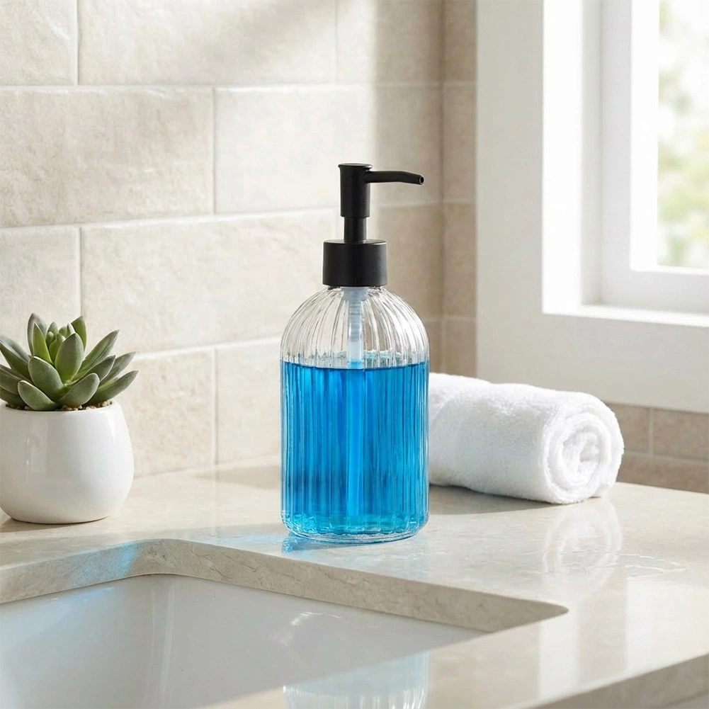 Elegante glazen dispenser voor vloeibare zeep of afwasmiddel met een inhoud van 400 ml, gekenmerkt door transparant geribbeld glas, een matzwarte pomp en een modern design. Gemakkelijk na te vullen, peilcontrole in één oogopslag en geschikt voor zowel badkamer als keuken.