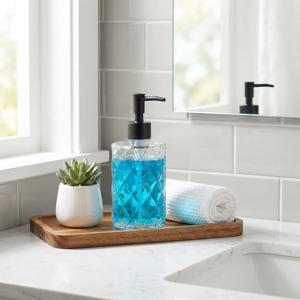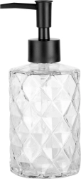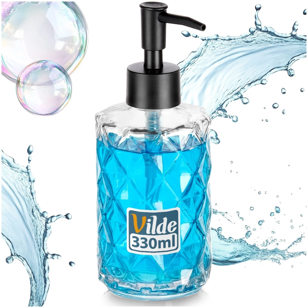 Stijlvolle glazen zeepdispenser met een inhoud van 330 ml, voorzien van een zwarte pomp en een decoratief diamantpatroon. Geschikt voor zowel de badkamer als de keuken. Het transparante glas maakt het eenvoudig om de vulling te controleren, makkelijk navullen bespaart tijd en het moderne design houdt je ruimte geordend en elegant.