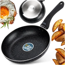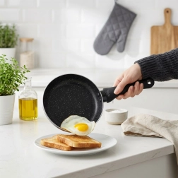 Compacte granieten pan 20 cm van gegoten aluminium voor dagelijks koken. Biedt een anti-aanbaklaag voor gezonder bereiden met minimale vetstof, snelle en gelijkmatige warmteverdeling en een ergonomische, koelblijvende handgreep met ophangoog. Geschikt voor alle soorten kookplaten, inclusief inductie en kan in de vaatwasser.