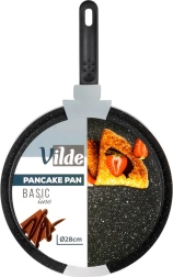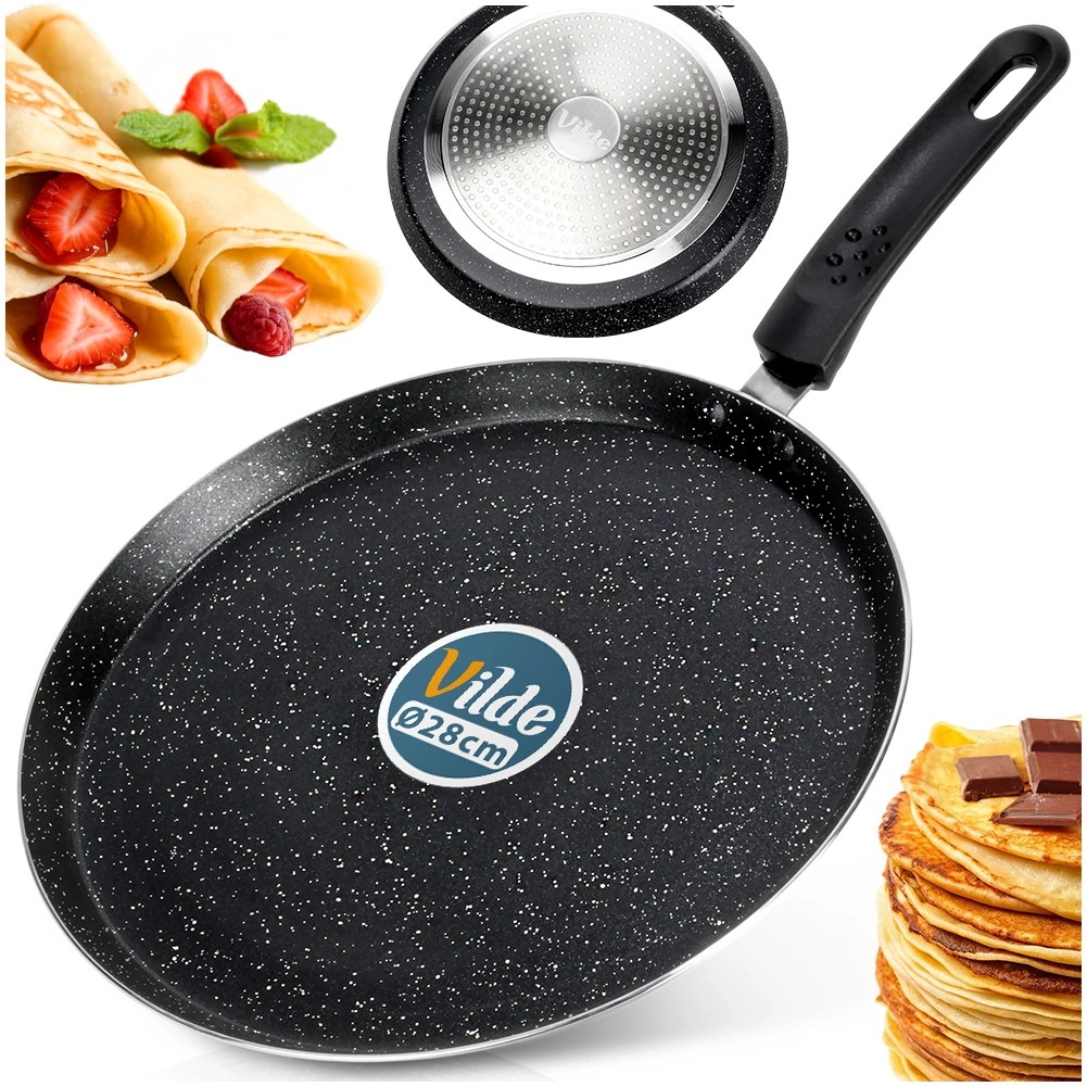 Lichte en duurzame pannenkoekenpan met een diameter van 28 cm met een granieten antiaanbaklaag voor vetarm bakken. Biedt een snelle en gelijkmatige warmteverdeling, een ergonomische, koelblijvende handgreep en is geschikt voor alle kookplaten, inclusief inductie. Eenvoudig te reinigen en vaatwasserbestendig.