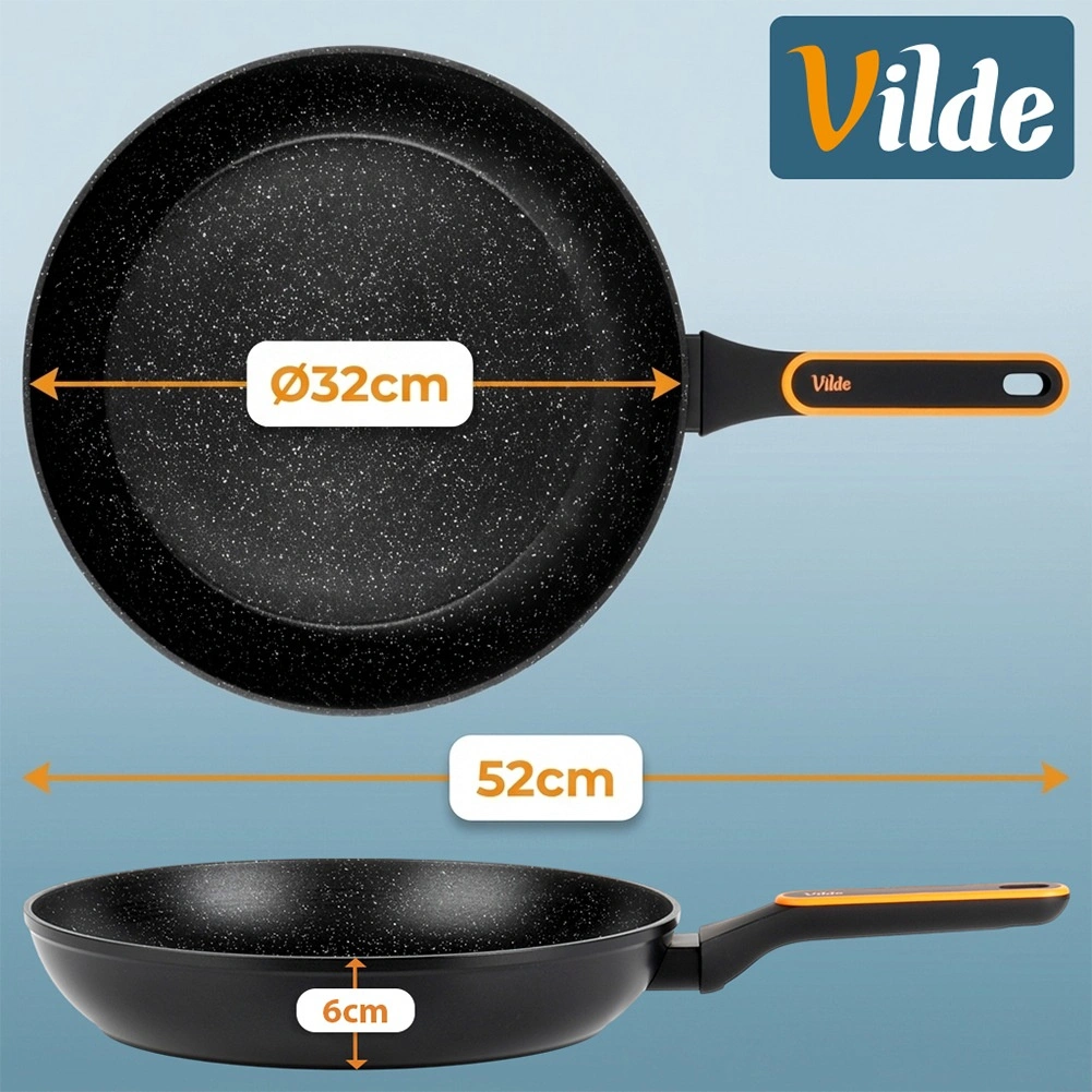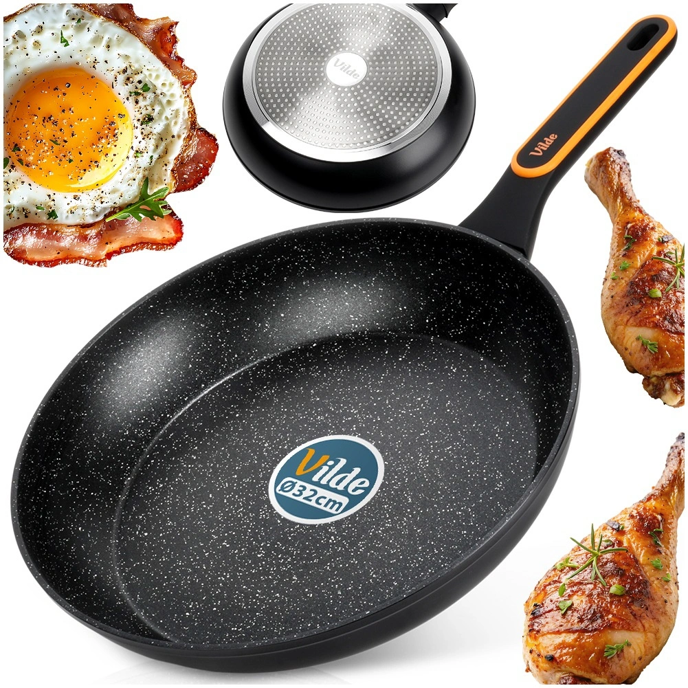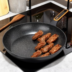 Universele granieten koekenpan met een diameter van 32 cm voor dagelijks koken. Dankzij het antiaanbakgranietoppervlak, de snelle en gelijkmatige warmteverdeling en de comfortabele, niet-verhittende handgreep bereid je vlees, groenten en eieren met minimaal vet op alle soorten kookplaten, inclusief inductie.