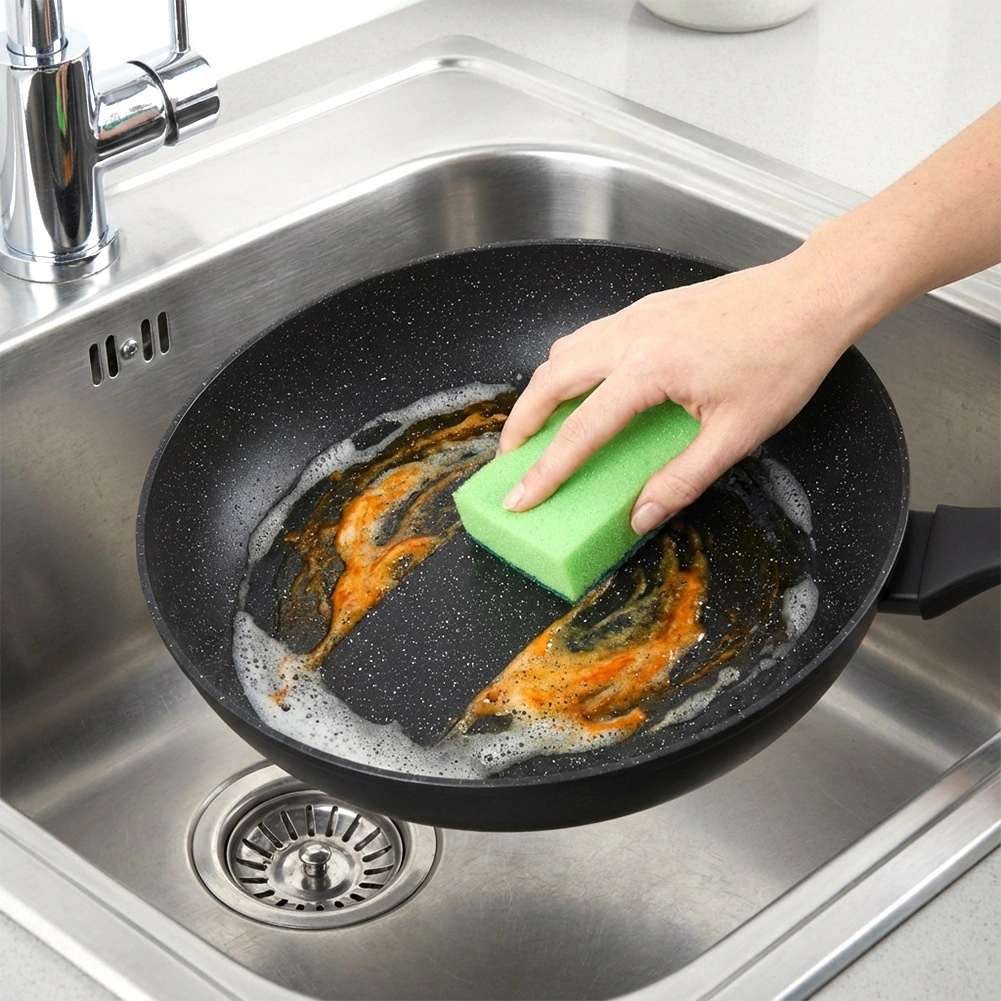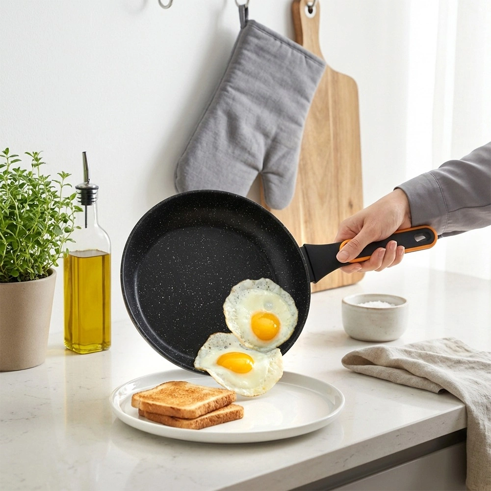 Het steenachtige oppervlak minimaliseert aanbranden en maakt bakken met weinig olie mogelijk. Het eten kan eenvoudig worden omgedraaid en de pan is snel schoon.
