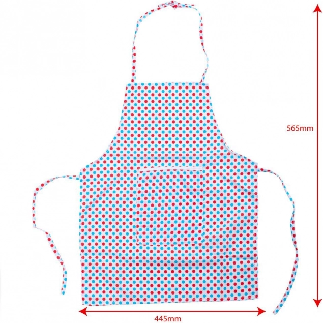Een comfortabel schort met gekleurde stippen beschermt kleding tijdens spel en echt bakken. De verstelbare muts met klittenband past zich eenvoudig aan de hoofdomtrek aan en blijft de hele dag comfortabel zitten.