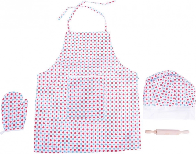 Geef jonge koks alles wat ze nodig hebben voor hun eerste baksels en leuk kookspel. Het lichte textiele schort met stippen beschermt kleding, de koksbaret is dankzij klittenband eenvoudig verstelbaar en de houten deegroller met metalen uitsteekvormpjes prikkelt creativiteit en plezier in maken.