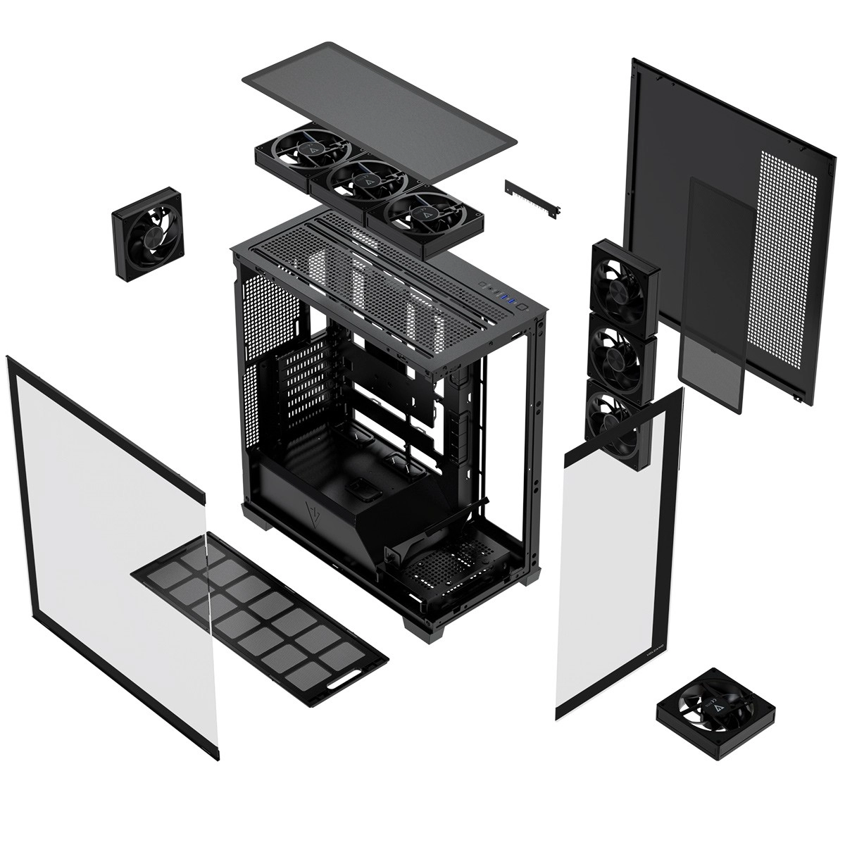 Stijlvolle behuizing voor gamers en creators met panoramisch “aquarium”-design van gehard glas, acht ARGB PWM-ventilatoren en een ARGB LED-strip. Biedt eersteklas luchtstroom, ruimte voor GPU tot 420 mm, CPU-koeler tot 175 mm, ondersteuning voor waterkoeling tot 360 mm en compatibiliteit met moederborden met omgekeerde connectors (BTF). Praktische schroefloze snelkoppel-zijpanelen, stoffilters en USB‑C op het I/O‑paneel benadrukken zowel functionaliteit als design.