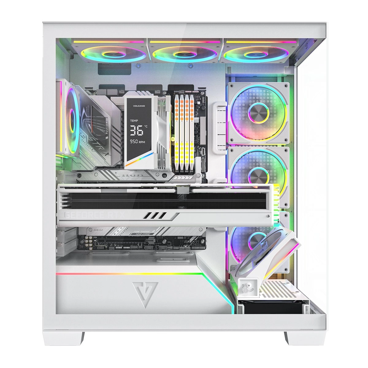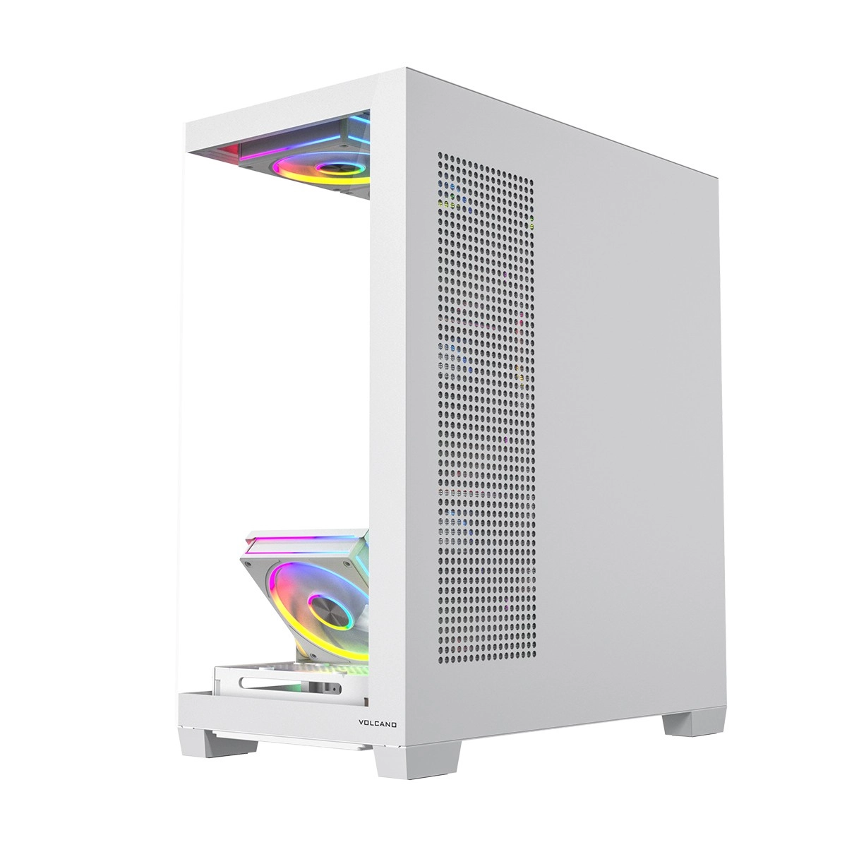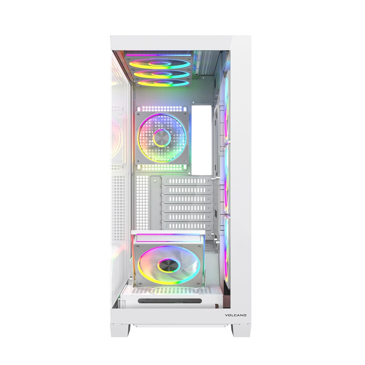 De Volcano Stellar Plus ARGB combineert een aantrekkelijke “aquarium”-stijl met uitstekende airflow. Acht PWM ARGB‑ventilatoren, inclusief drie met omgekeerde bladen en een verstelbaar zijframe voor directe koeling van de GPU, houden de temperaturen in toom tijdens lange gamesessies. Gehard glas aan de zijkant en voorkant zet je componenten fraai in de kijker, terwijl de ARGB‑LED‑strip op de PSU‑shroud zorgt voor een visueel “wow”-effect.