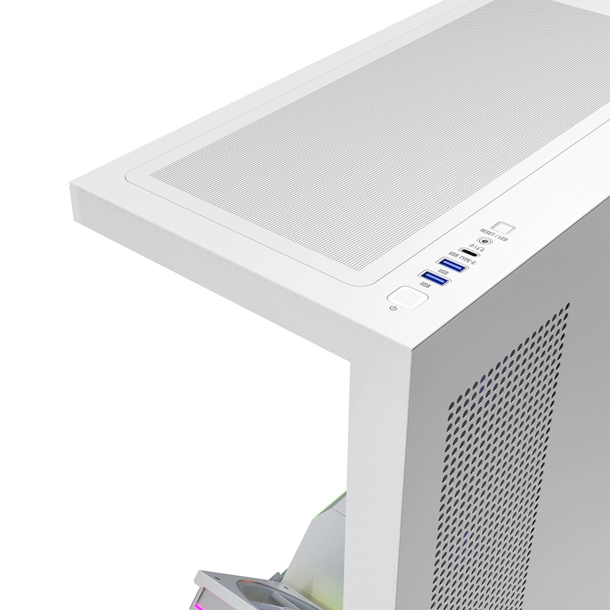 Voor- en zijpaneel van gehard glas accentueren de componenten en ARGB‑verlichting. De strakke look wordt benadrukt door een LED‑strip op de PSU‑shroud.