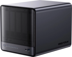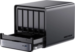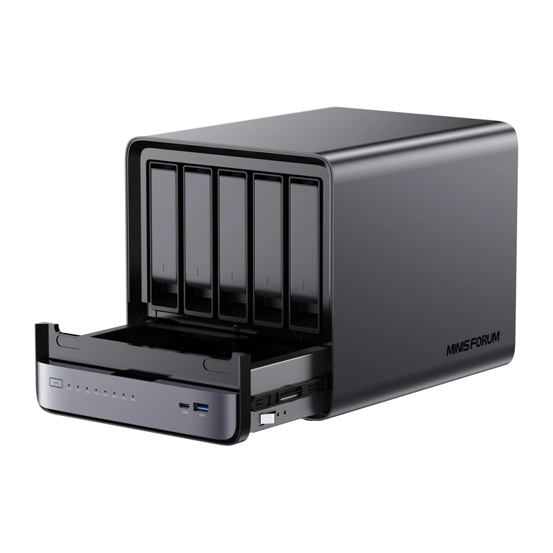 De compacte MINISFORUM NAS N5 combineert de kracht van een mini-pc met de flexibiliteit van een NAS. Hij biedt een 8-core AMD Ryzen 7 met Radeon 780M grafische kaart, tot 96 GB DDR5, ruimte voor maximaal 8 drives met een capaciteit tot 144 TB, snelle netwerken 10 GbE + 5 GbE, moderne connectiviteit USB4 en HDMI 2.1 en uitbreidingen via PCIe x16 en OCuLink. Het MinisCloud OS zorgt voor eenvoudige beheer, ZFS-snapshots en beveiligde externe toegang.