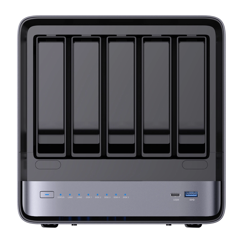 - 5 × 3,5" / 2,5" HDD (tot 22 TB per schijf, SATA 3.0)