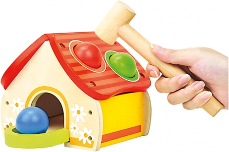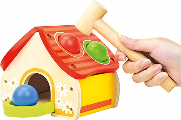 Deze kwalitatieve houten speelgoedset in de vorm van een vrolijk huisje spreekt kinderen aan met heldere kleuren en een eenvoudig spelprincipe – de balletjes worden in de openingen op het dak gelegd en met het hamertje zachtjes ingeklopt. Het spel ondersteunt de ontwikkeling van motoriek, geduld en nauwkeurigheid.