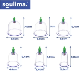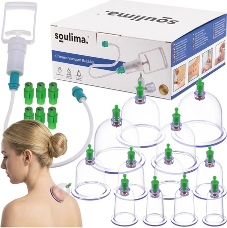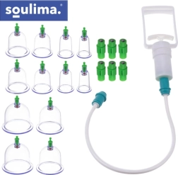 De SOULIMA vacuümcup-set is een praktische oplossing voor cupping thuis zonder vlam. Met het handpompje stel je eenvoudig de onderdruk in, wat zorgt voor een veiliger en preciezer behandeling. Verschillende cupmaten maken het mogelijk zowel grotere spiergroepen als kleinere, gevoeligere zones te behandelen. Magnetische opzetstukken ondersteunen de gerichte stimulatie van acupressuurpunten.