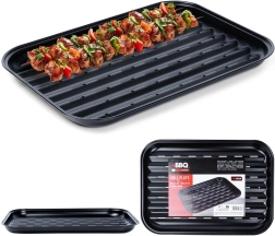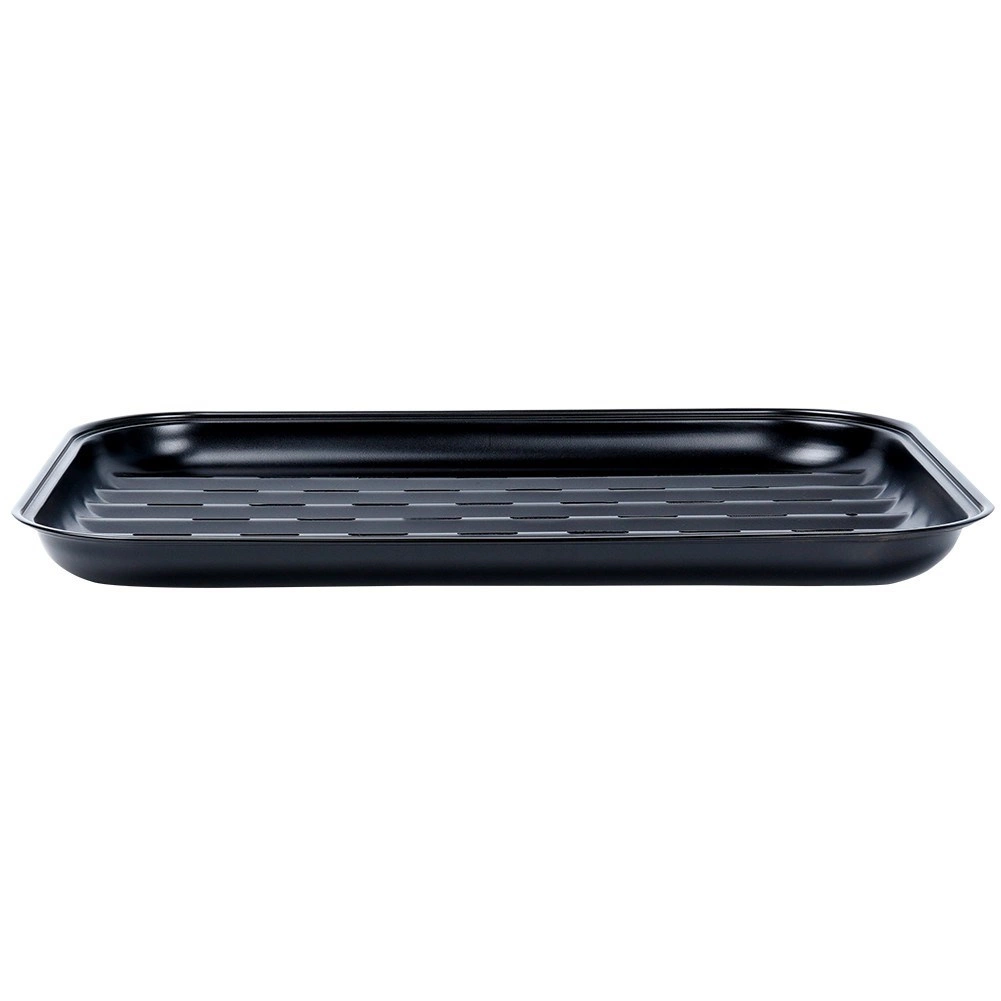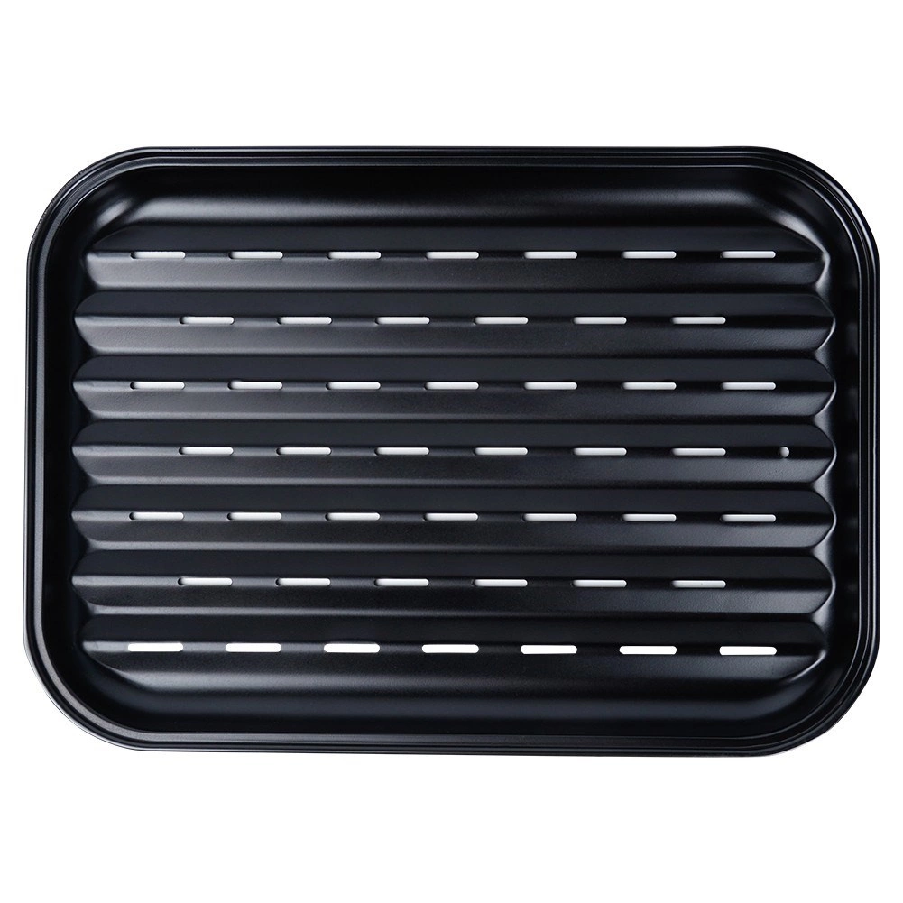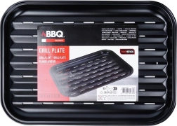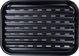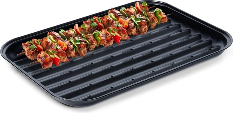 De robuuste plaat van 34,5 × 24 × 2 cm is gemaakt van hoogwaardig staal met antiaanbakcoating, waardoor voedsel niet aanbakt en reinigen eenvoudig is. Dankzij de perforatie en ribbels loopt vet efficiënt weg en gaart het voedsel niet in het eigen vocht – zo krijg je een knapperige korst en een volle smaak.