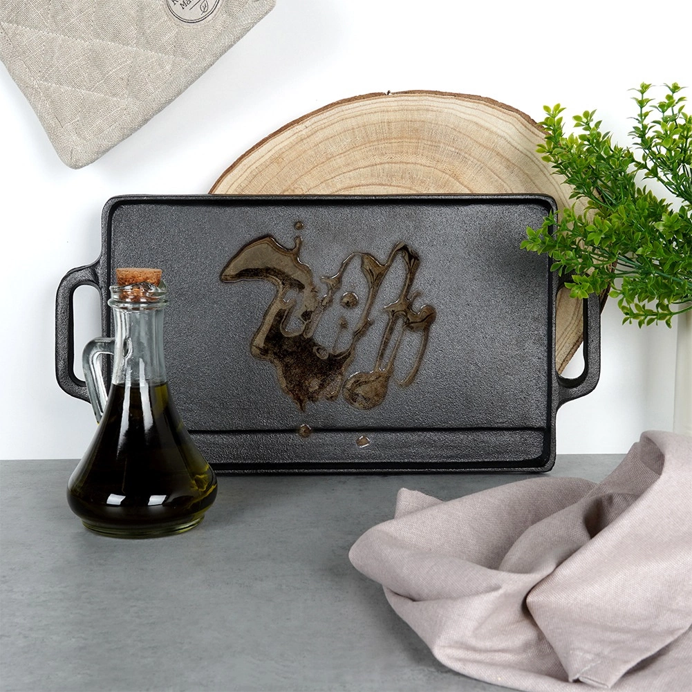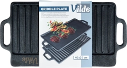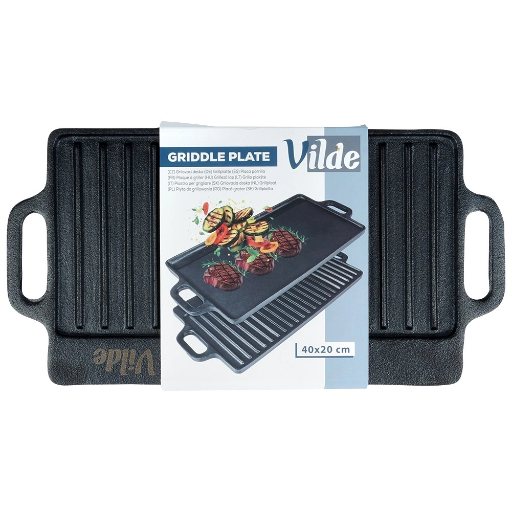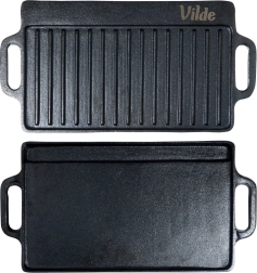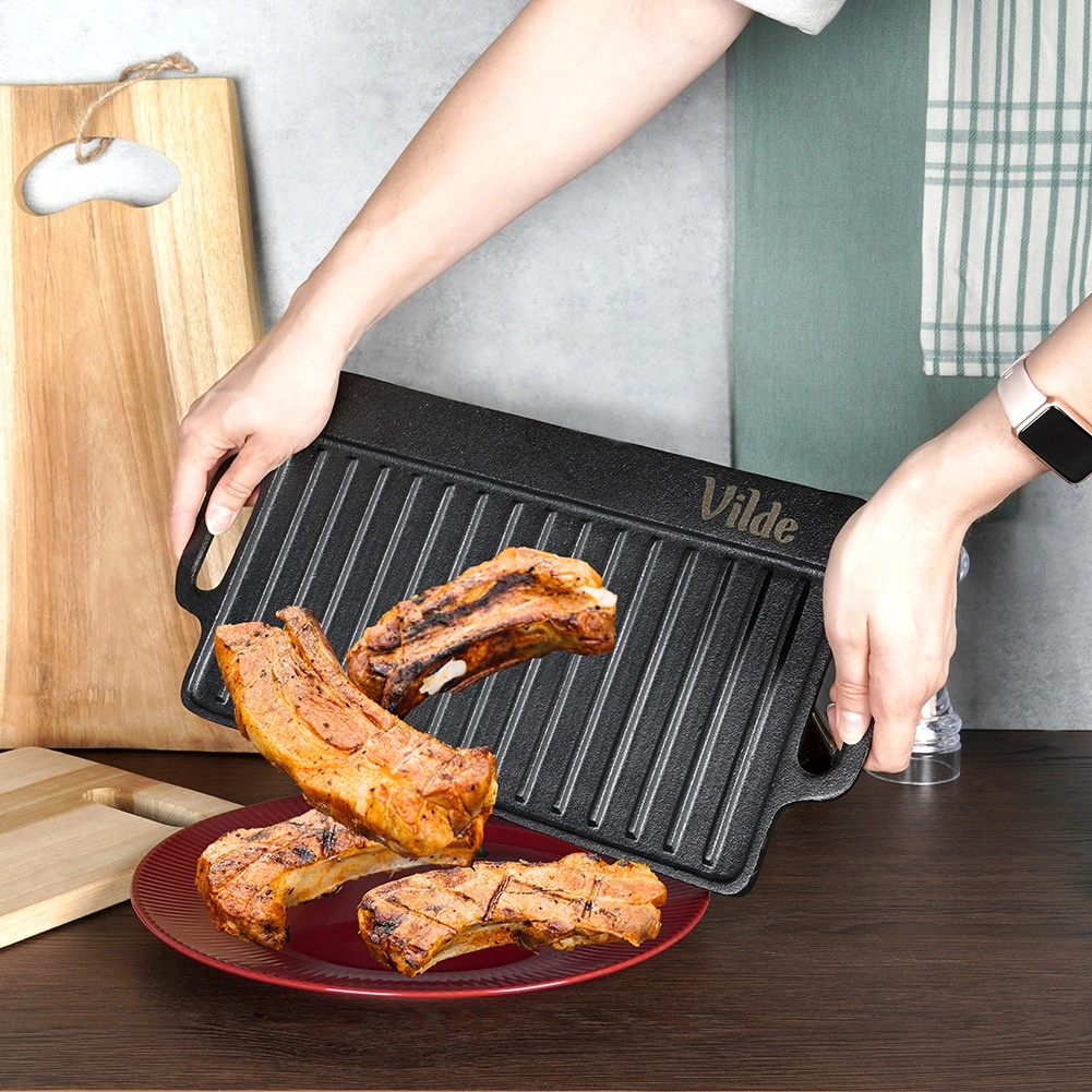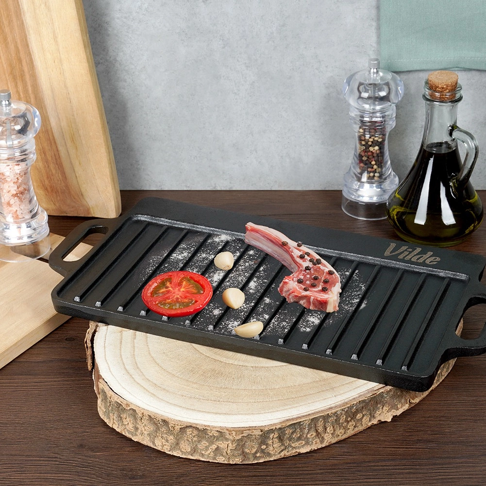 Dubbelzijdige gietijzeren grillplaat van 40 × 20,5 cm voor perfecte steaks, vis en groenten. Dankzij het massieve materiaal accumuleert ze warmte uitstekend, verdeelt die gelijkmatig en zorgt voor een opvallend grillraster op gegrilde gerechten. De ene kant is vlak voor bakken en aanbraden, de andere geribbeld voor grillen met vetafvoer. Geschikt voor fornuis, oven en barbecue.