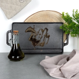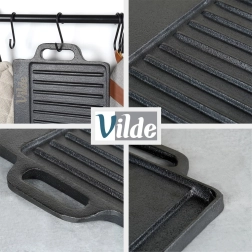 De robuuste dubbelzijdige plaat van hoogwaardige gietijzer kan intensief dagelijks gebruik aan, thuis en buiten. Gietijzer zorgt voor een stabiele temperatuur, ideaal voor snel aanbraden, gelijkmatige garing en mooi bruinen zonder aan te bakken. Dankzij de geïntegreerde handgrepen verplaats je haar gemakkelijk van het fornuis naar de tafel voor stijlvol serveren.