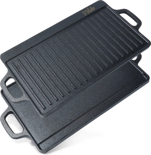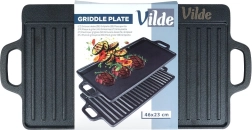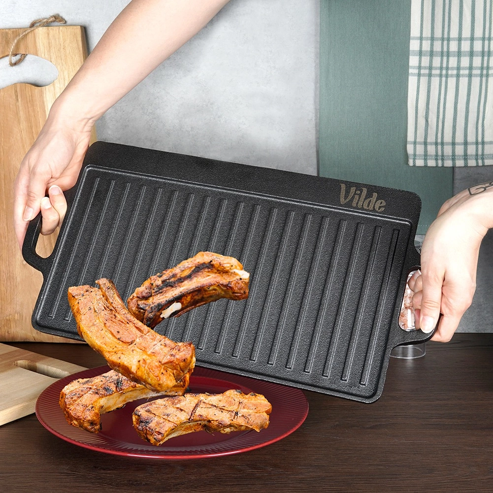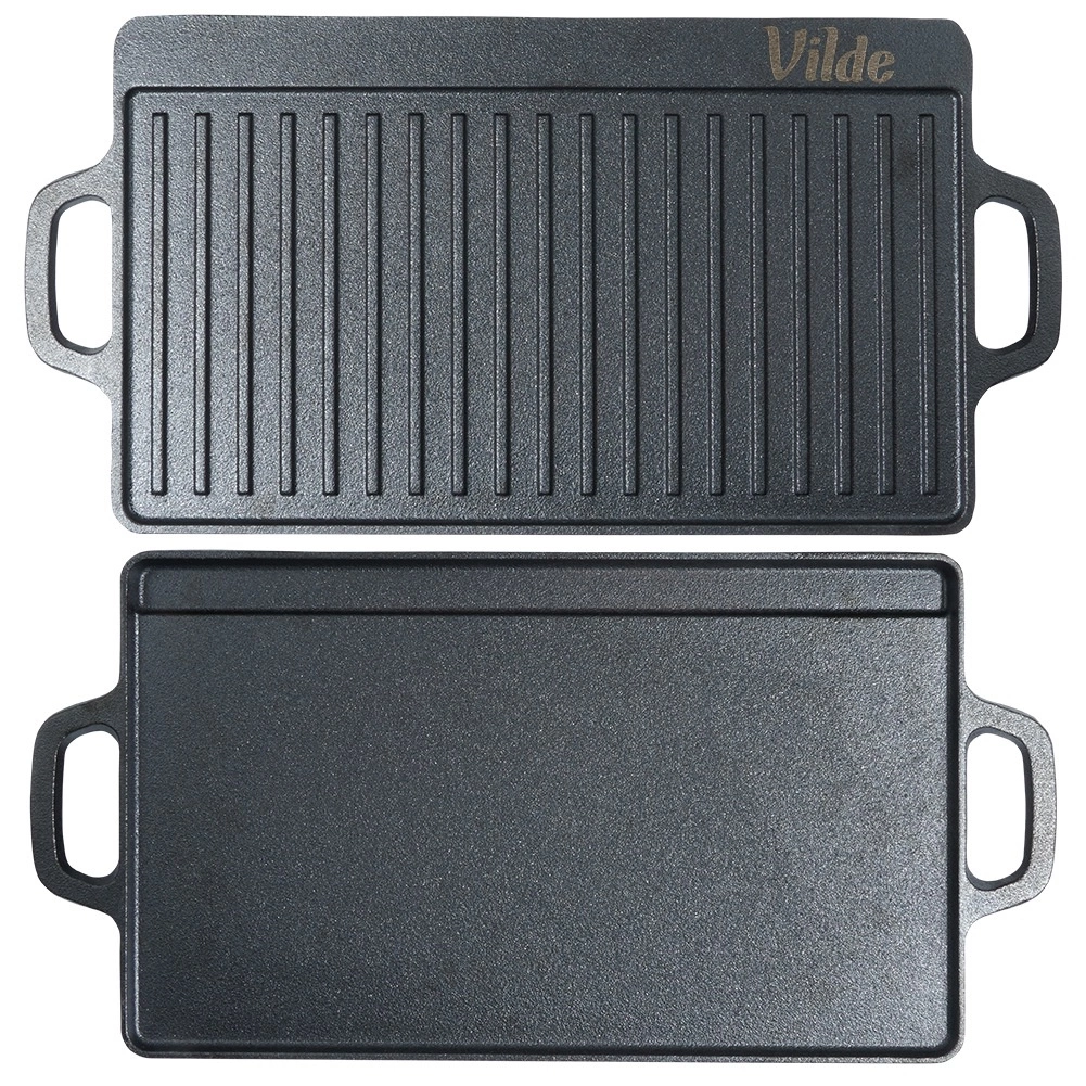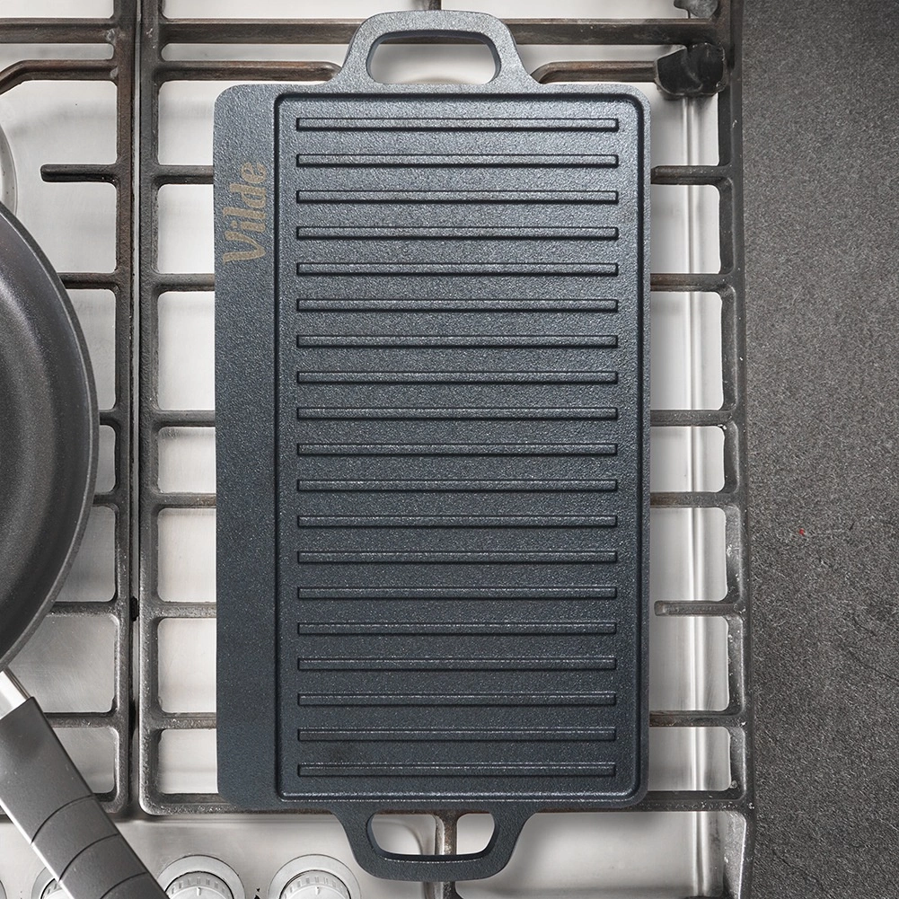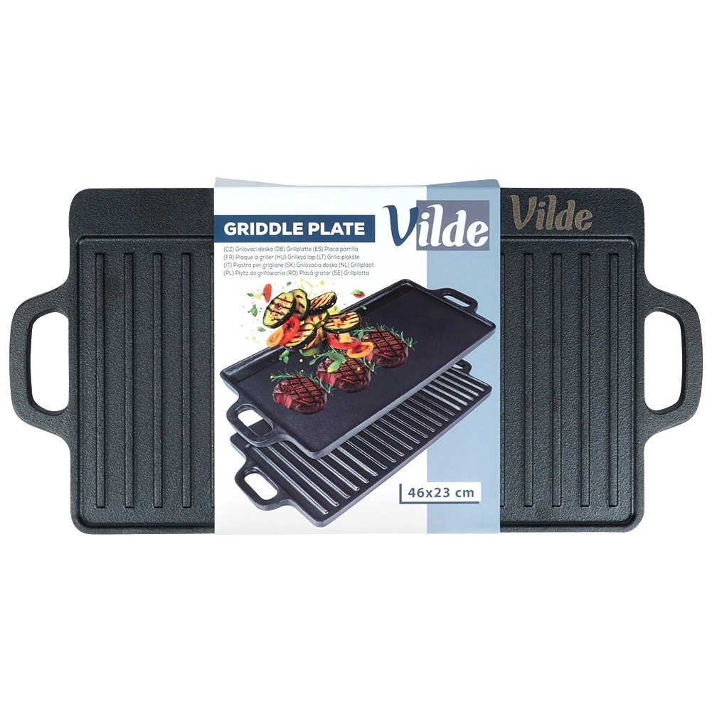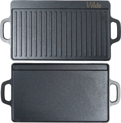 Duurzame dubbelzijdige gietijzeren grillplaat VILDE CAST LINE met afmetingen 45,5 × 22,5 cm, met één gladde en één geribbelde zijde voor veelzijdig koken. Gietijzer warmt gelijkmatig op, houdt warmte uitstekend vast en is geschikt voor kookplaat, oven en grill.