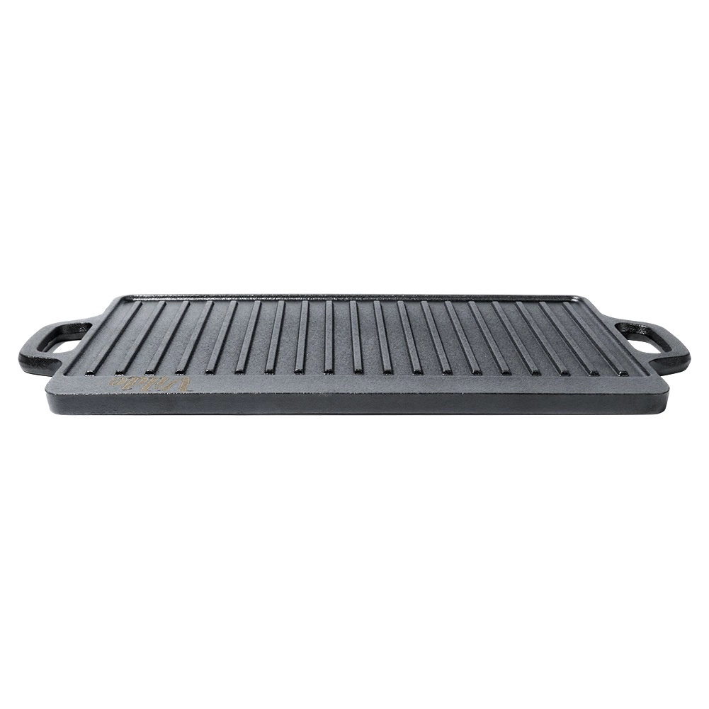Deze robuuste gietijzeren plaat is ideaal voor het grillen van vlees, vis, groenten en steaks. Het dubbelzijdige ontwerp biedt maximale flexibiliteit: een gladde zijde voor pannenkoeken, eieren of burgers en een geribbelde zijde voor opvallende grillstrepen en vetafvoer. Dankzij de hoge thermische massa houdt gietijzer de temperatuur stabiel en zorgt het voor gelijkmatige garing.