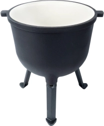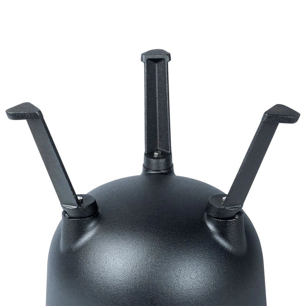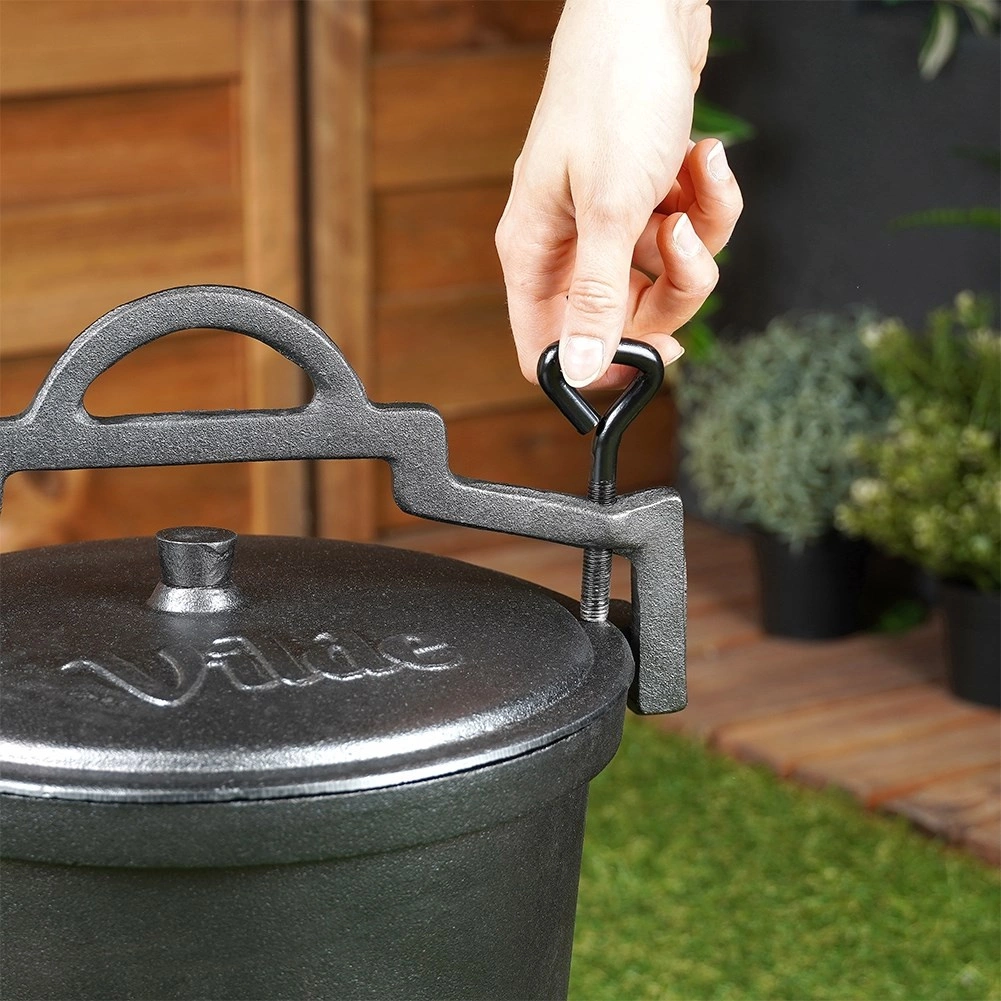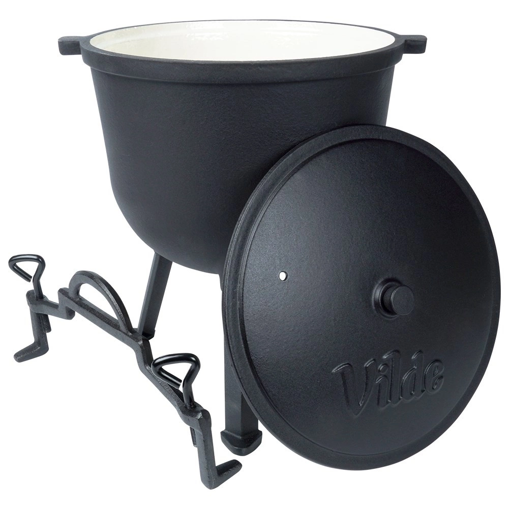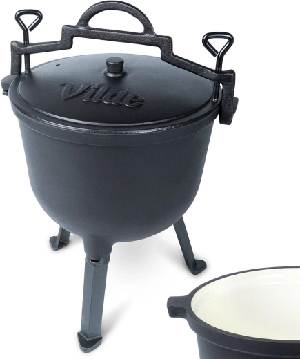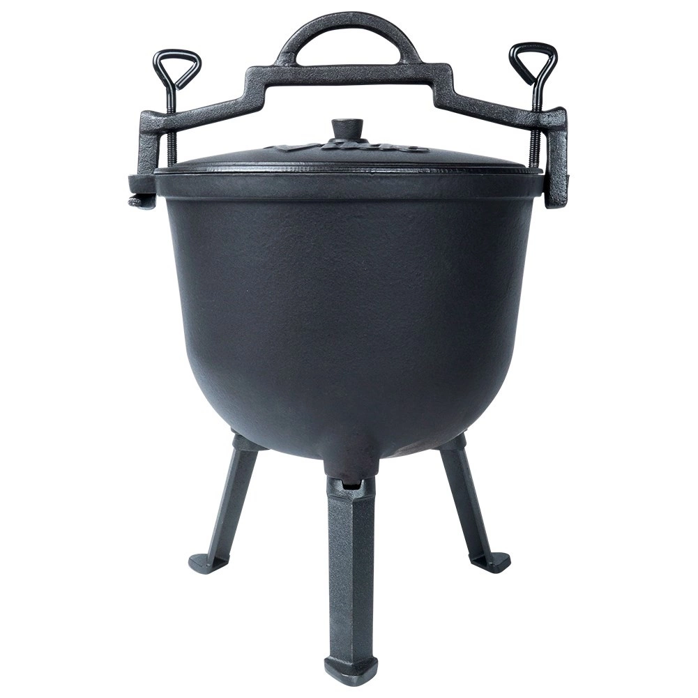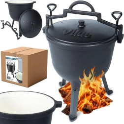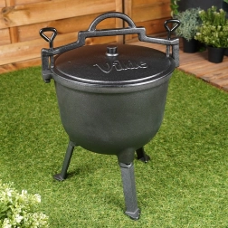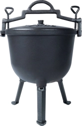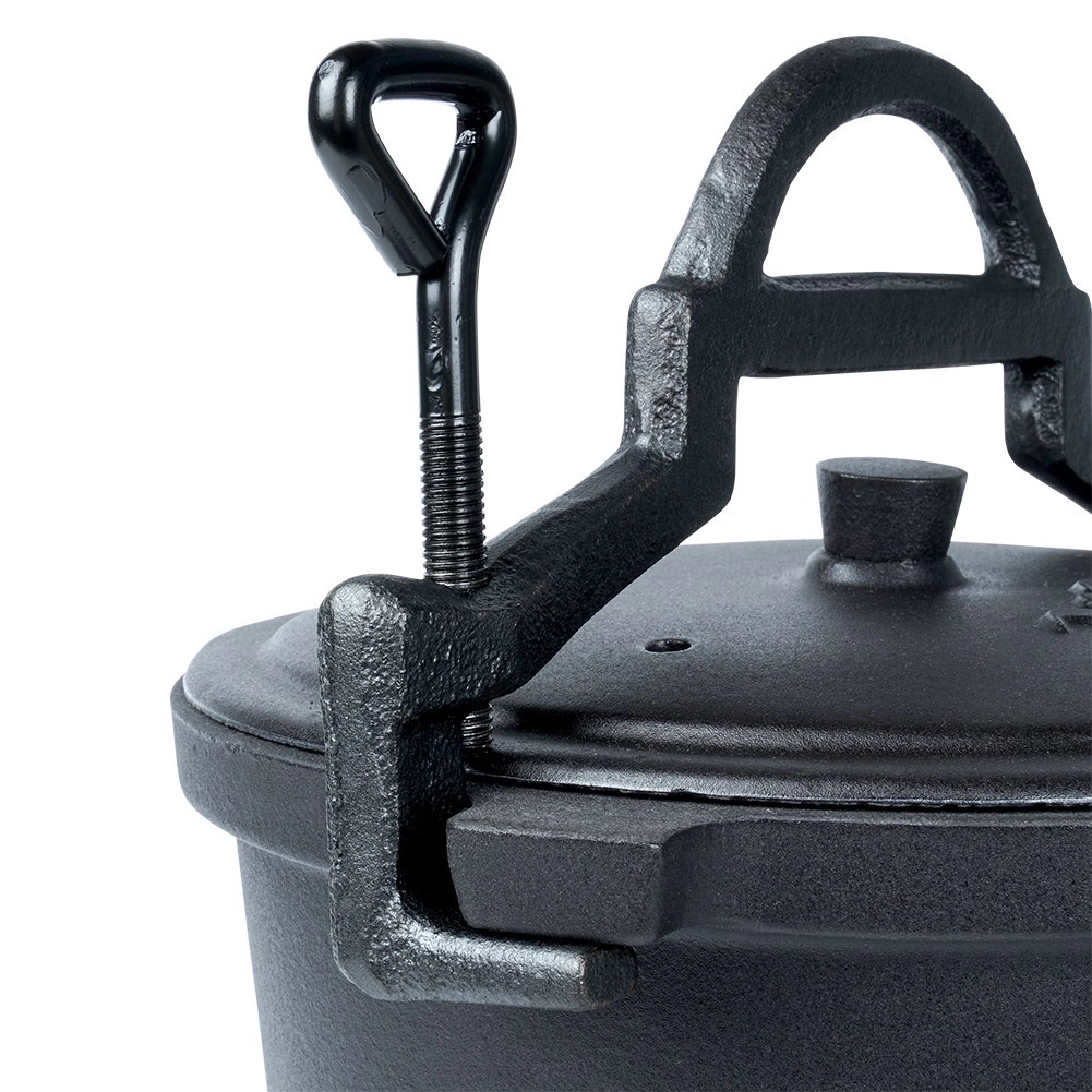 De ketel staat op drie stabiele pootjes voor veilig gebruik op het vuur of boven het stookvlak. Het deksel heeft een ventilatieopening en twee vergrendelingsschroeven voor veilig sluiten tijdens het koken of vervoeren. Een grote bovenbeugel en zijgrepen maken het hanteren eenvoudig. Ideaal voor tuin, camping of elke vorm van buitenkoken – gerechten krijgen een unieke smaak en aroma.