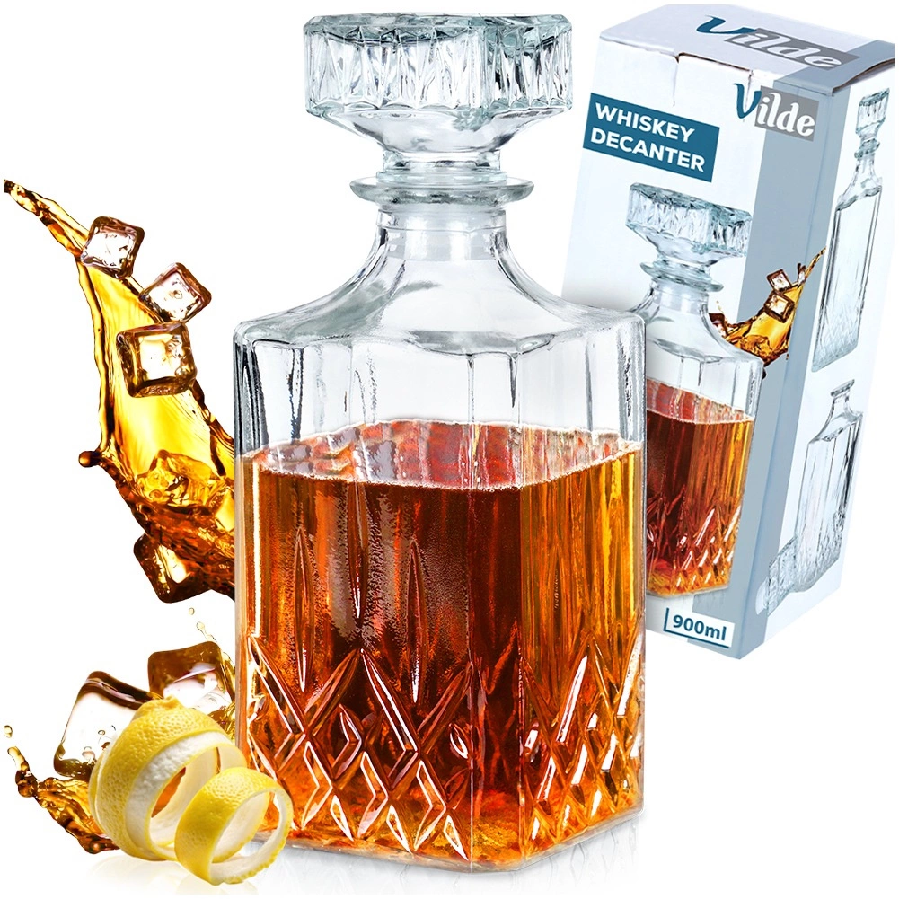 Elegante glazen karaf met kurksluiting in een modern vierkant design, ideaal voor het serveren van whisky en andere dranken. Biedt een maximale inhoud van 900 ml en een comfortabele bruikbare inhoud van 750 ml voor eenvoudige hantering. Gemaakt van duurzaam, helder glas, vaatwasmachinebestendig en behoudt aroma en smaak dankzij de stevige afsluiting. Het stijlvolle design geeft uw tafelsetting een decoratieve uitstraling en is ook een prachtig cadeau voor liefhebbers van kwaliteitsdistillaten.