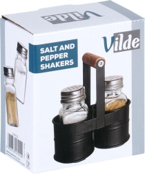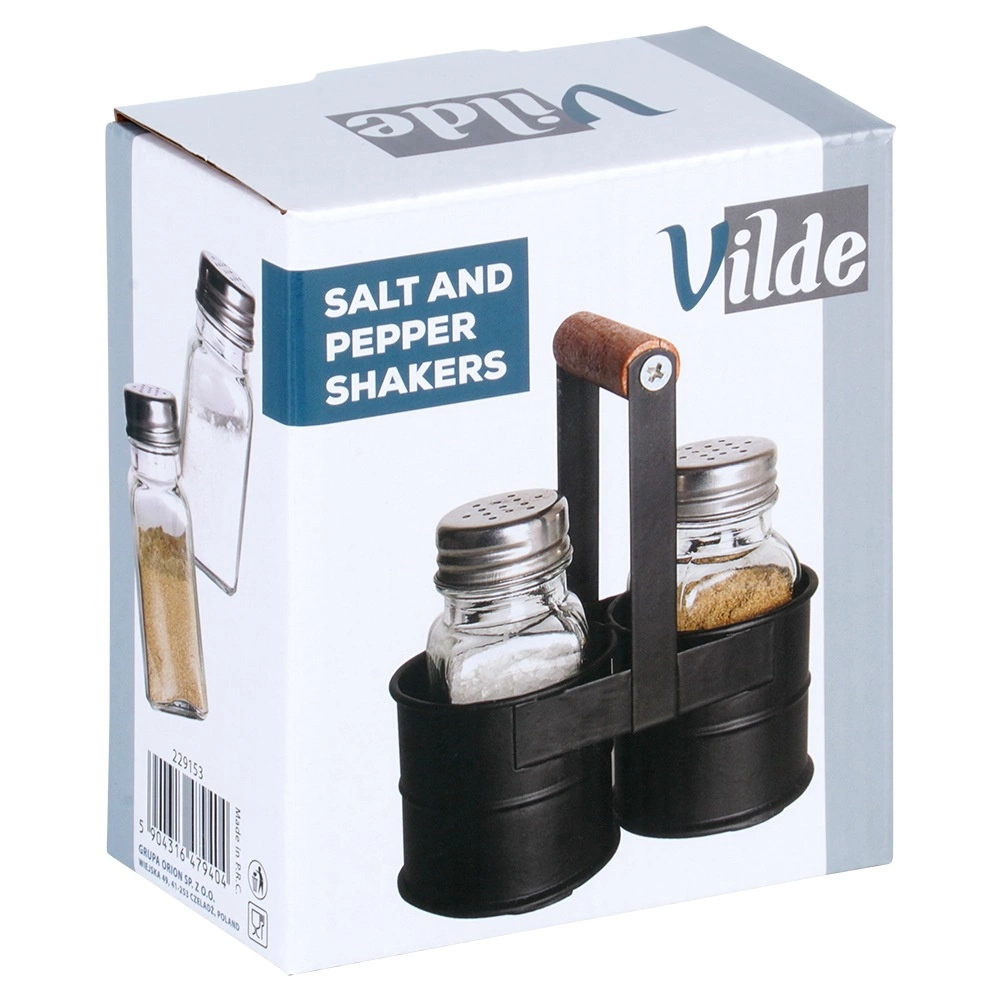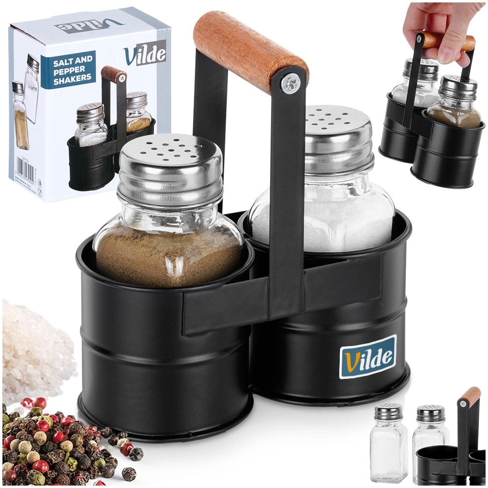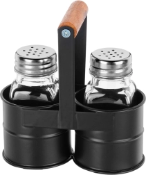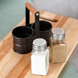 Praktische set van twee glazen strooiers voor zout en peper in een stevige metalen houder met houten handgreep. Biedt comfortabele dosering, georganiseerde opslag en een tijdloos design dat in elke keuken past.