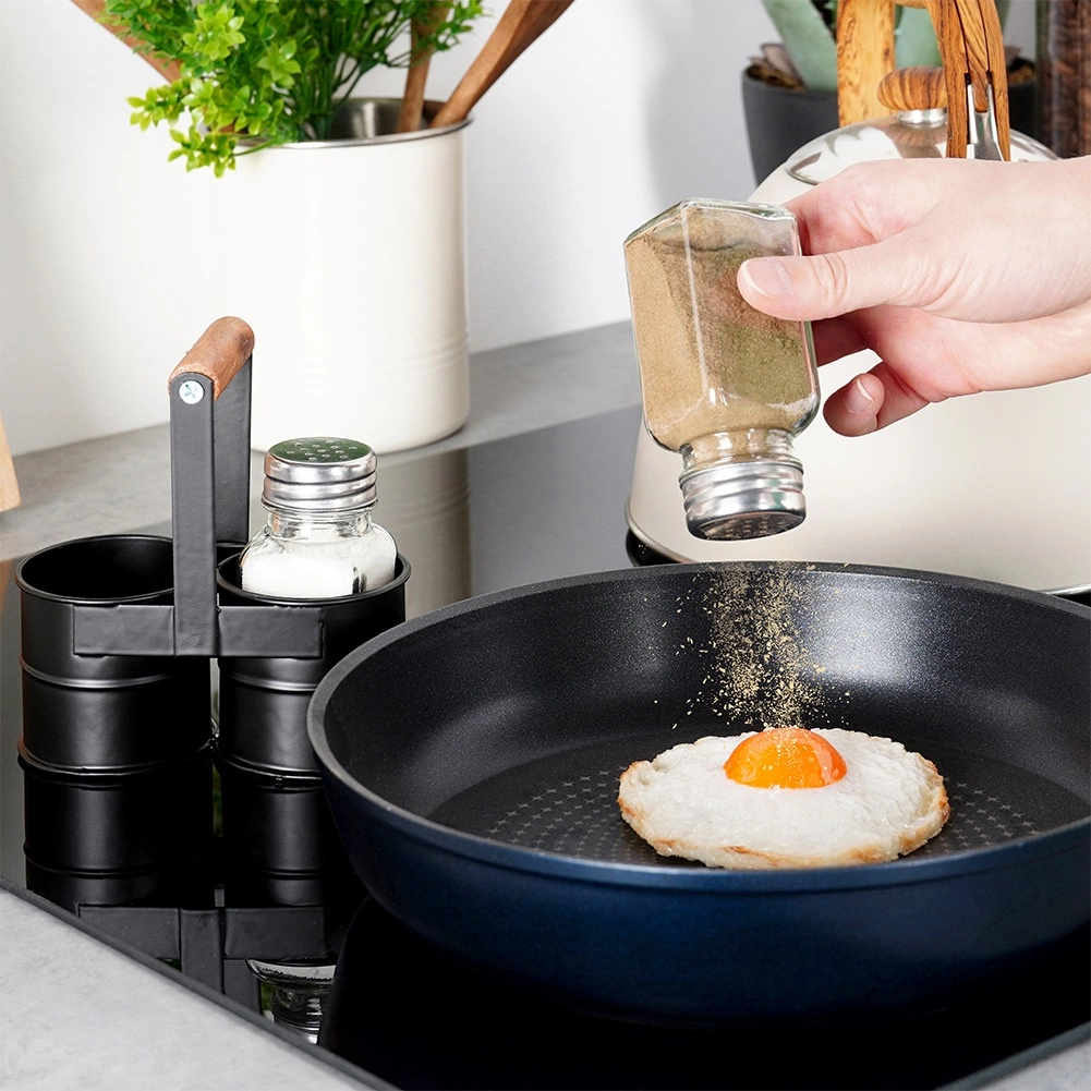 Deze 3-delige set combineert twee transparante glazen strooiers (80 ml) met metalen doppen en een duurzame zwarte houder met houten handgreep. Dankzij de fijne gaatjes in de doppen doseer je nauwkeurig zonder risico op overmatig zouten of peperen.