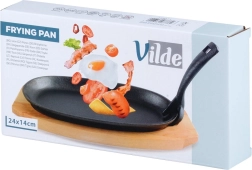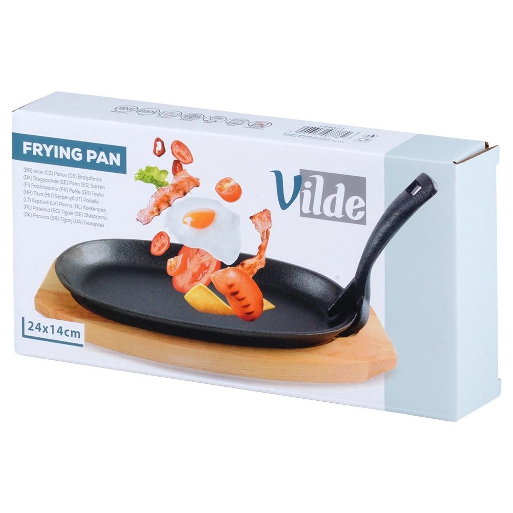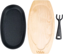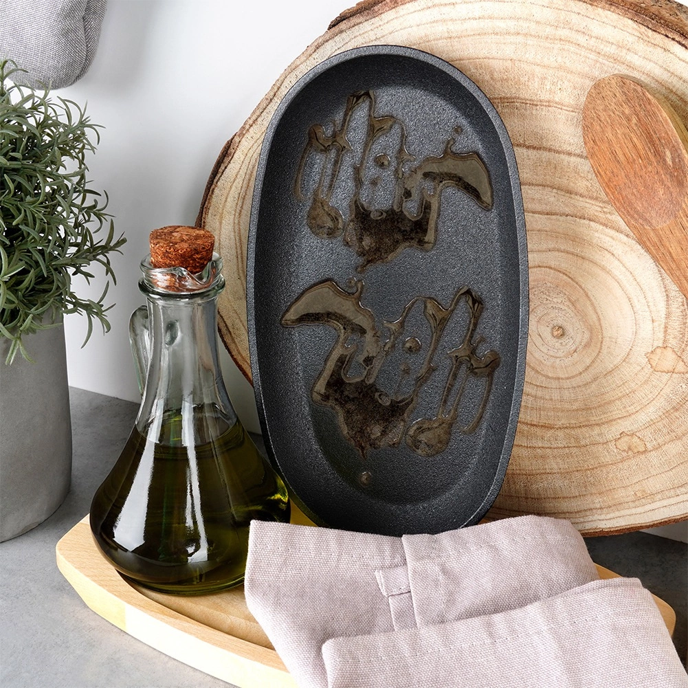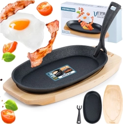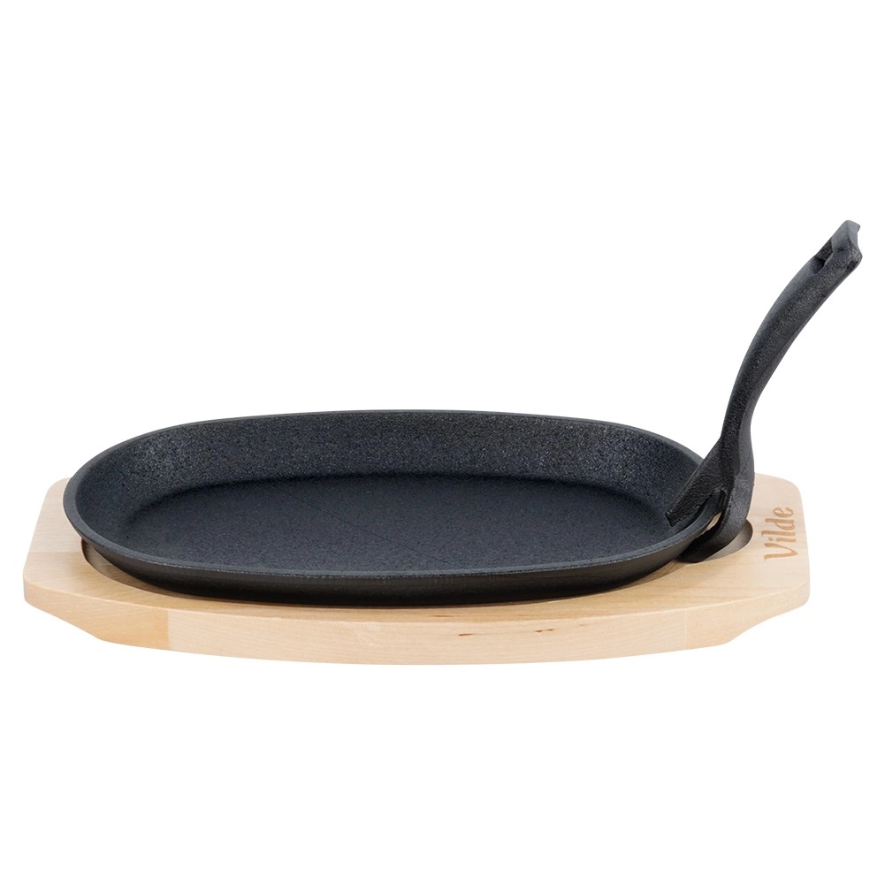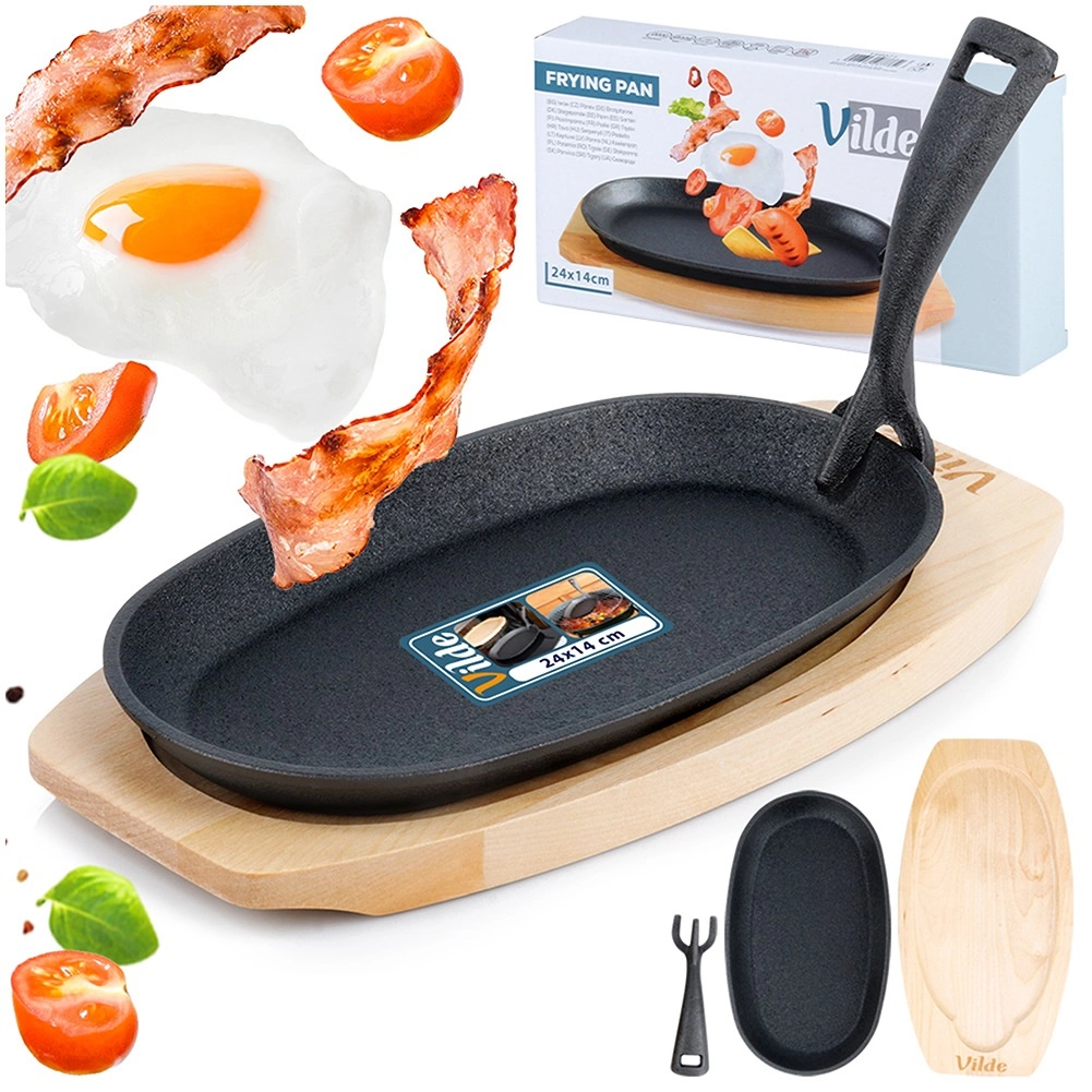 Deze ovale gietijzeren pan van 24 × 14 × 2 cm met afneembare handgreep en massieve houten plank (28 × 19 cm) is ideaal voor grillen, bakken, braden en serveren. Gietijzer warmt gelijkmatig op en houdt warmte perfect vast, zodat vlees, groenten of aardappelen sappig en heerlijk heet blijven tijdens het serveren.